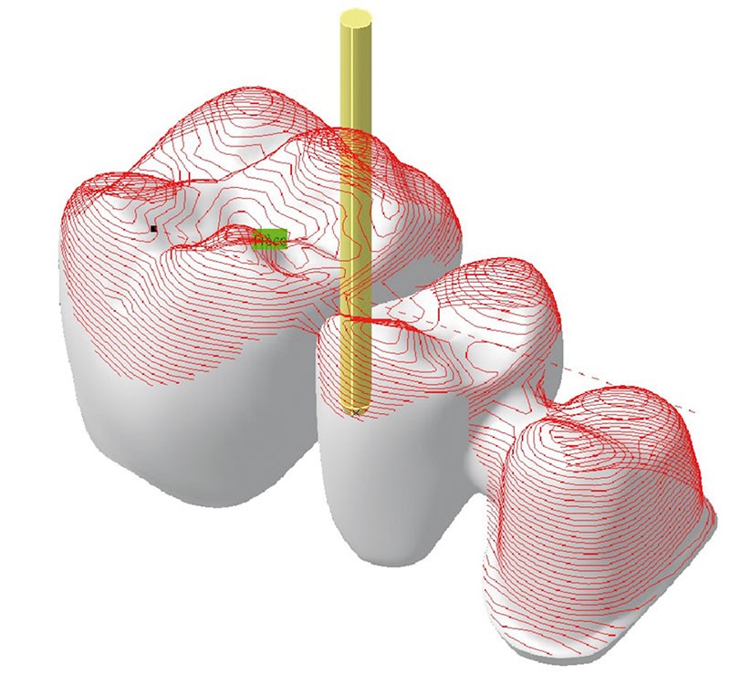 La chaîne numérique mise en œuvre dans ce contexte est classiquement présentée sous la forme de trois maillons consécutifs : la numérisation, la CAO et la FAO (3, 4). Ces maillons sont commercialisés sous différents packages où logiciels et équipements sont pré-intégrés. Ces solutions pré-intégrées sont souvent liées à la chaîne de production : la production directe tout au cabinet, la production indirecte tout au laboratoire, la production semi-directe : réalisation d’une empreinte optique au cabinet et réalisation de la prothèse au laboratoire.