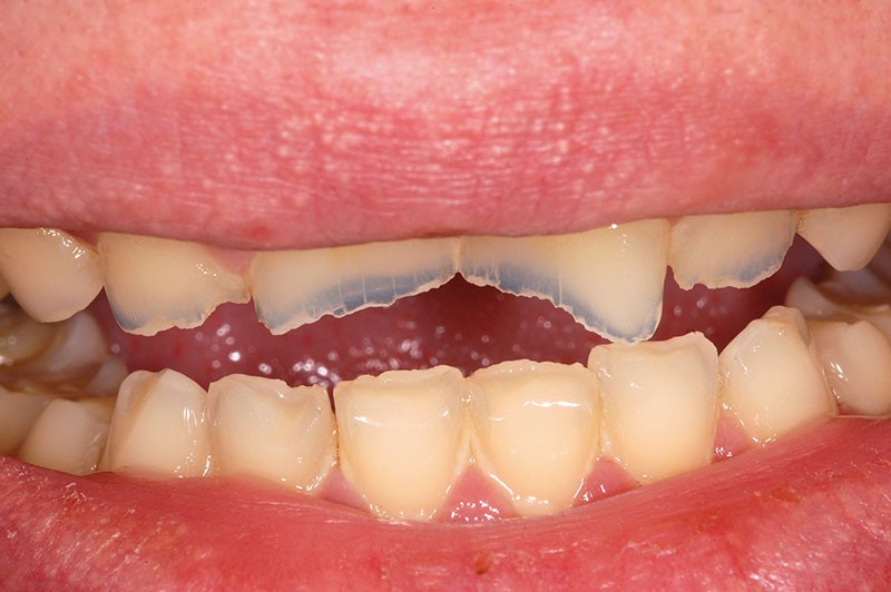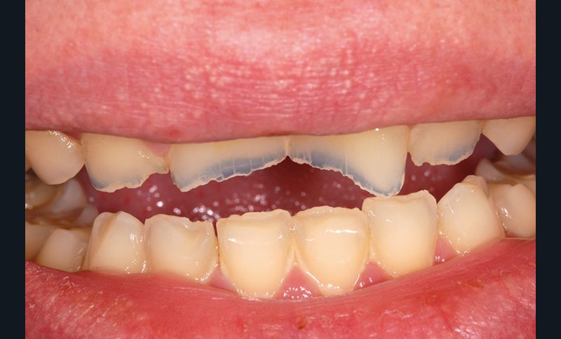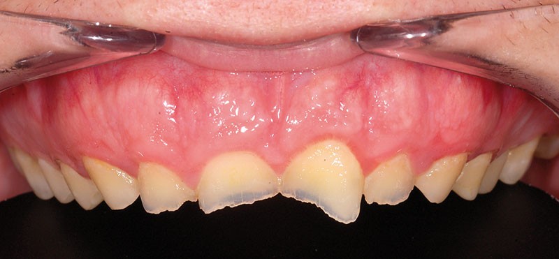 À l’examen clinique, les dents, principalement antérieures, présentent des pertes de substances importantes de classe V selon la classification ACE (Anterior Clinical Erosive Classification) de Vailati [1] (fig. 1 à 6).