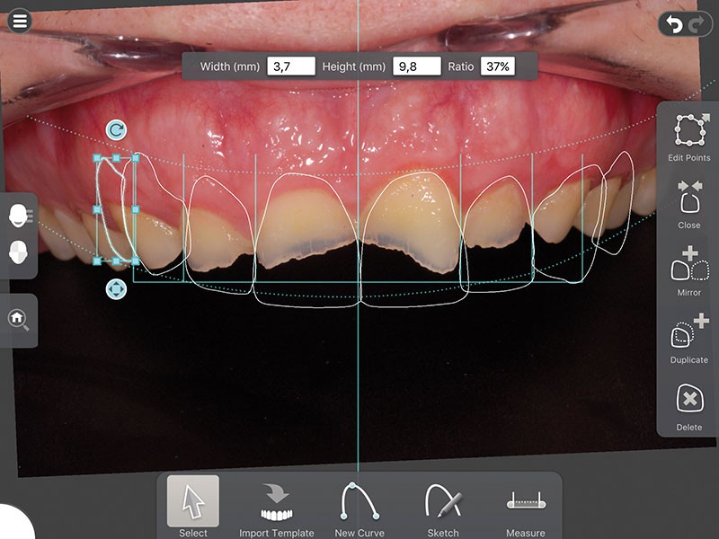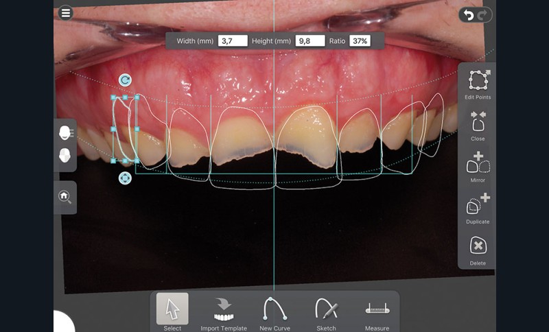 L’analyse esthétique peut être réalisée par différents logiciels mis actuellement à notre disposition (ici, Digital Smile Design) [3] pour prévisualiser les formes de dents ainsi que le positionnement idéal des collets anatomiques (fig. 9).