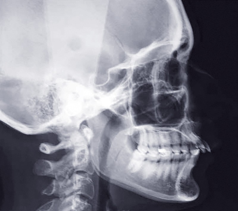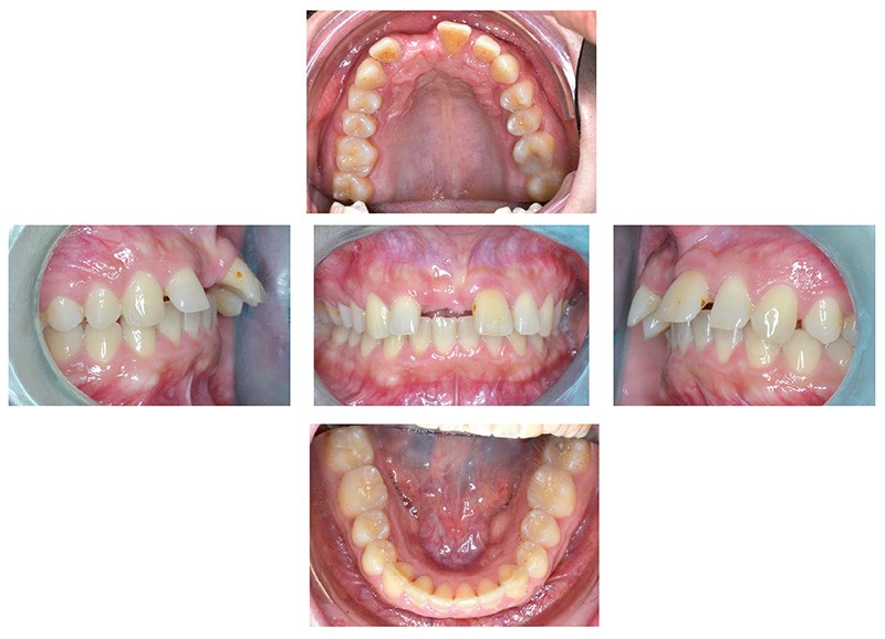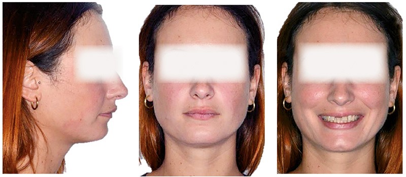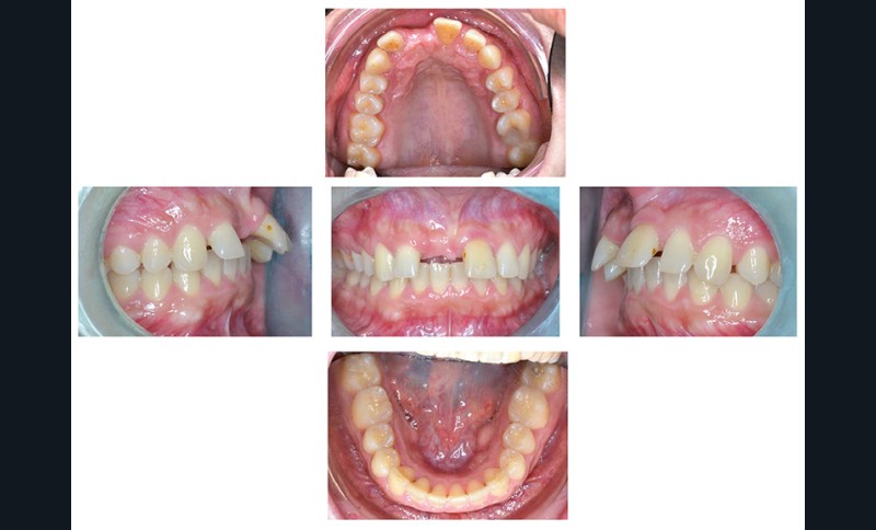 Charlotte présente donc une absence de 11, un surplomb et un recouvrement augmentés associés à une retromandibulie. La patiente a un profil convexe, hypodivergent avec une proalvéolie maxillaire et une classe II d’Angle. (fig. 1a à h). La radiographie panoramique confirme l’absence de 11 et la téléradiographique de profil, révèle une classe II squelettique (ANB : 6°, AoBo : 9 mm) par rétromandibulie ainsi qu’une proalvéolie maxillaire prononcée.
