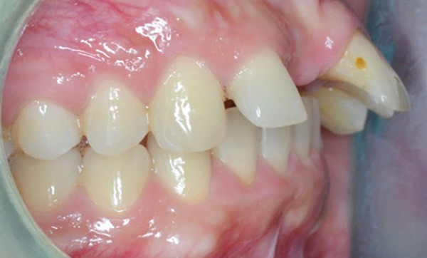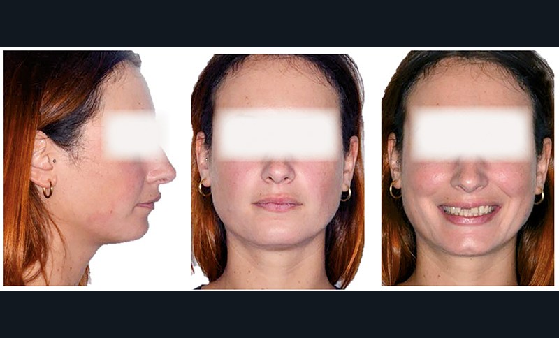 La patiente est appareillée une semaine avant la chirurgie d’avancée mandibulaire première sans mise en place de l’arc (Chirurgie réalisée par le Dr Laurentjoye). Dix jours après la chirurgie, les premiers arcs (.016 Niti) sont mis en place, avec l’utilisation de tractions intermaxillaires d’intercuspidation tendance classe II (fig. 3b). Après la réalisation du traitement et la mise en place d’une dent provisoire sur l’arc à la taille et la forme souhaitées…