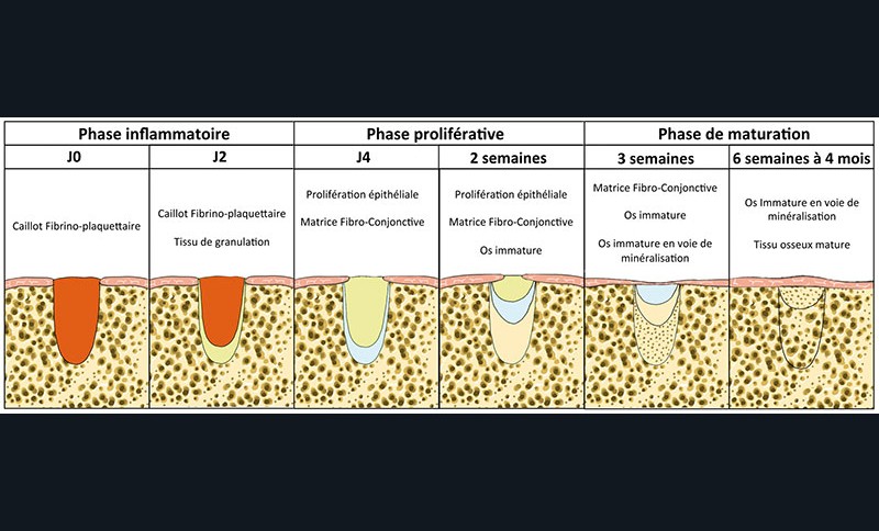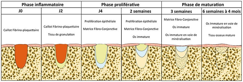 D’un point de vue macroscopique et microscopique, une série d’événements caractérisent la cicatrisation osseuse intervenant après une extraction dentaire. Ils peuvent être regroupés en 3 étapes : une phase inflammatoire, une phase proliférative et une phase de maturation par modelage et remodelage osseux (fig. 1).