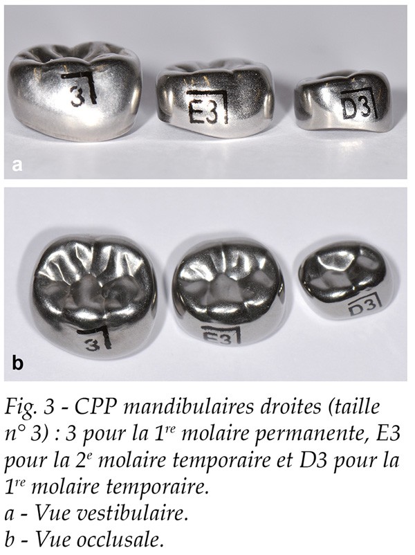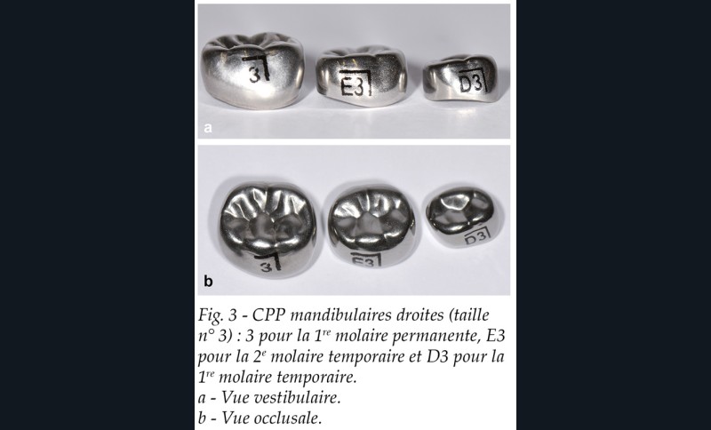 Bien que leur utilisation soit préconisée par les spécialistes en odontologie pédiatrique, peu d’omnipraticiens posent des couronnes pédiatriques préformées métalliques (CPP) métalliques. Les principales raisons avancées sont le temps nécessaire et la coopération du patient indispensable pour un bon ajustage ainsi que le coût [1, 2]. Or, elles font partie de l’arsenal thérapeutique du praticien depuis les années 1950. Elles sont en alliage inoxydable (nickel-chrome) de très faible épaisseur, ce qui leur confère l’élasticité nécessaire à leur mise en place et à leur rétention. Commercialisées en coffret (3M™ Espe™), elles existent en différentes tailles qui s’adaptent à la morphologie des premières et deuxièmes molaires temporaires (les CPP destinées aux molaires permanentes sont disponibles dans un coffret spécifique) (fig. 1 à 3). Elles présentent les avantages d’avoir un coût peu élevé, un temps d’exécution rapide (pas de préparation complexe, pas de protocole de collage délicat).