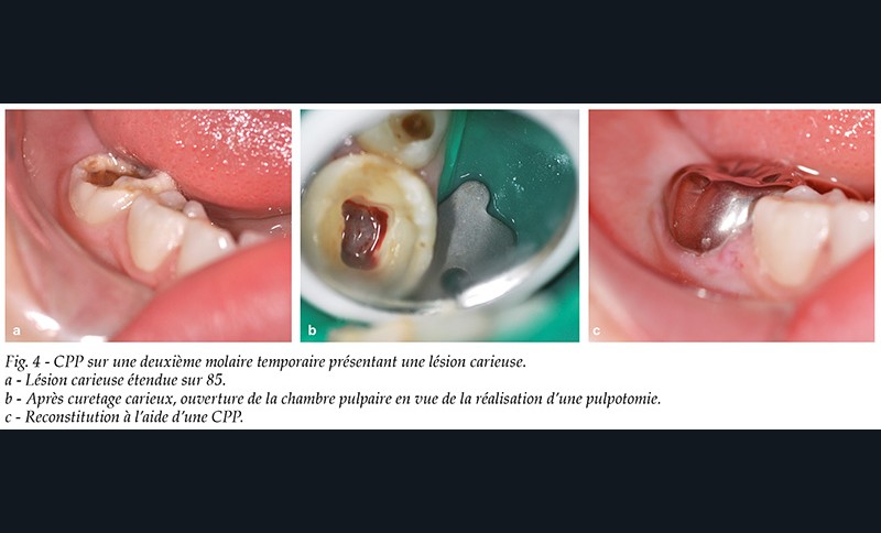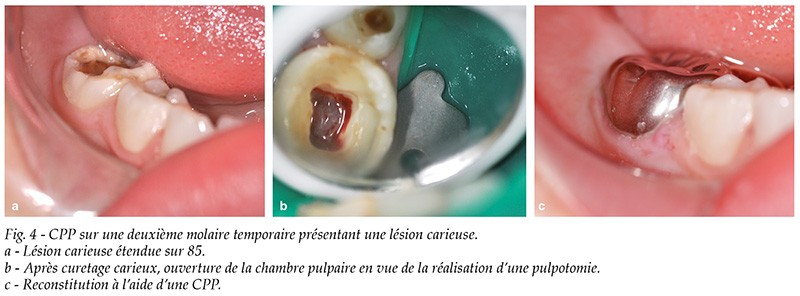 • reconstitution des molaires temporaires présentant des lésions carieuses intéressant plus de 2 faces sur les molaires temporaires ou lorsque la lésion est de grande étendue (fig. 4),