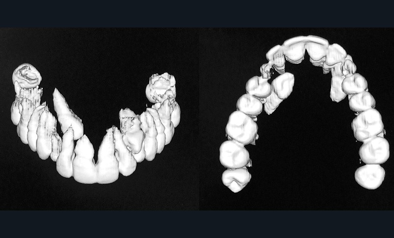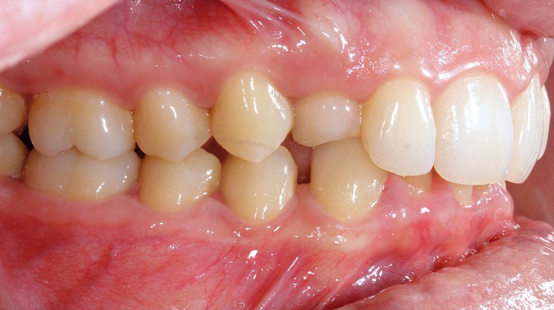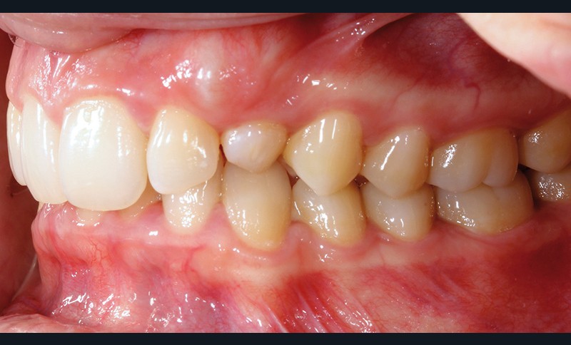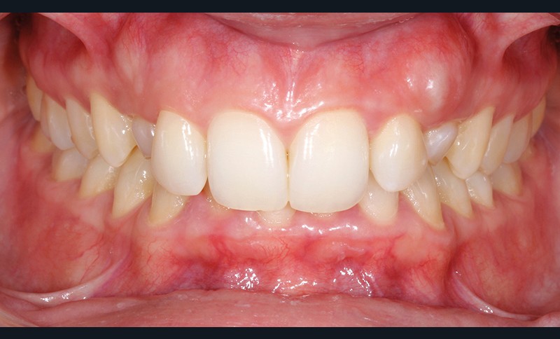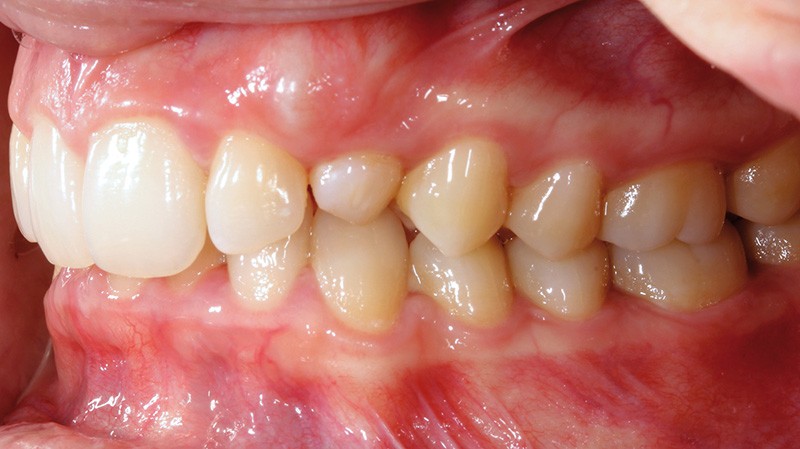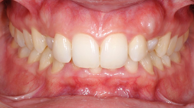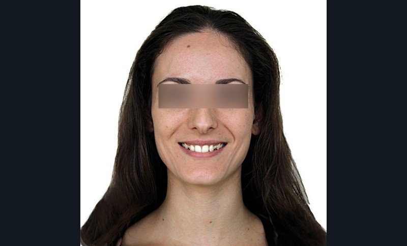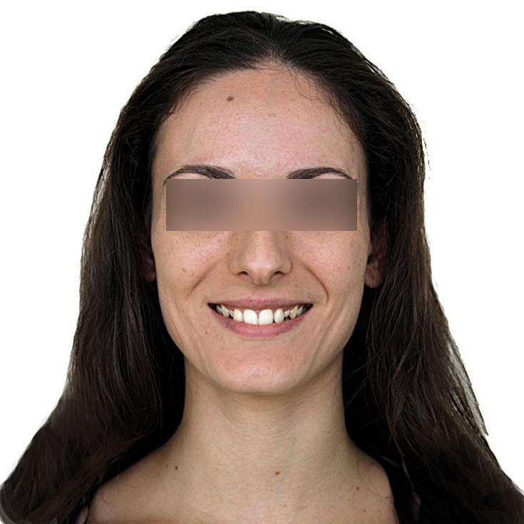 Aline se présente à la consultation pour une demande esthétique concernant ses deux canines lactéales qu’elle trouve trop petites et trop blanches (fig. 1a). Elle présente une classe II squelettique légère sur un schéma méso-divergent. D’un point de vue dentaire, une supraclusion est associée à une classe II d’Angle complète à gauche et de 4 mm à droite. Les canines maxillaires sont incluses (une vestibulaire et une palatine), avec persistance de leurs dents lactéales sur l’arcade (fig. 1b-h).
