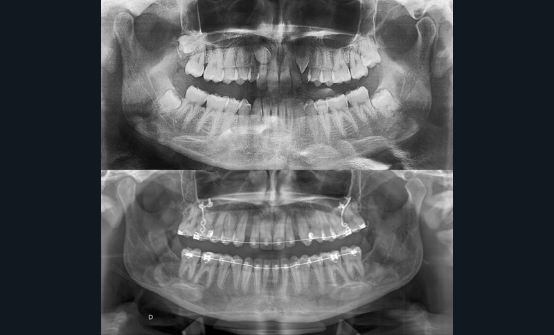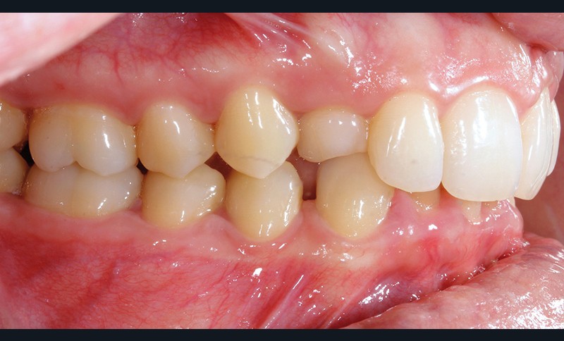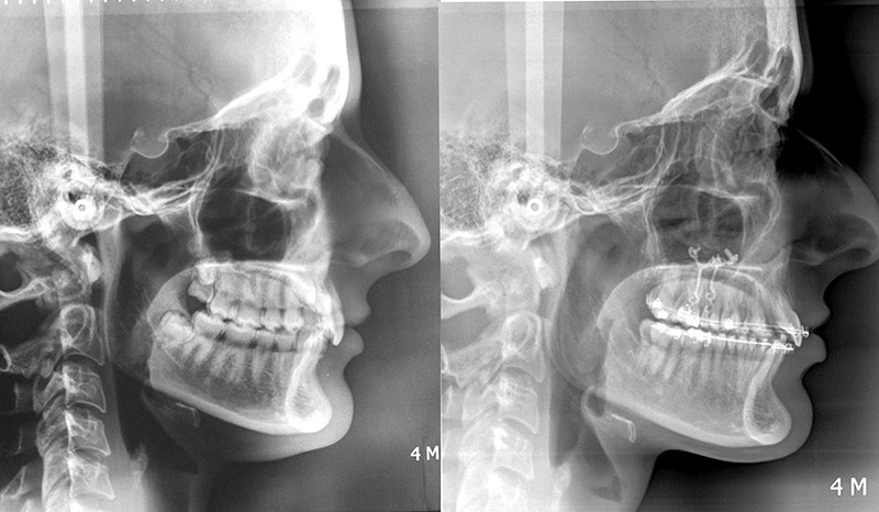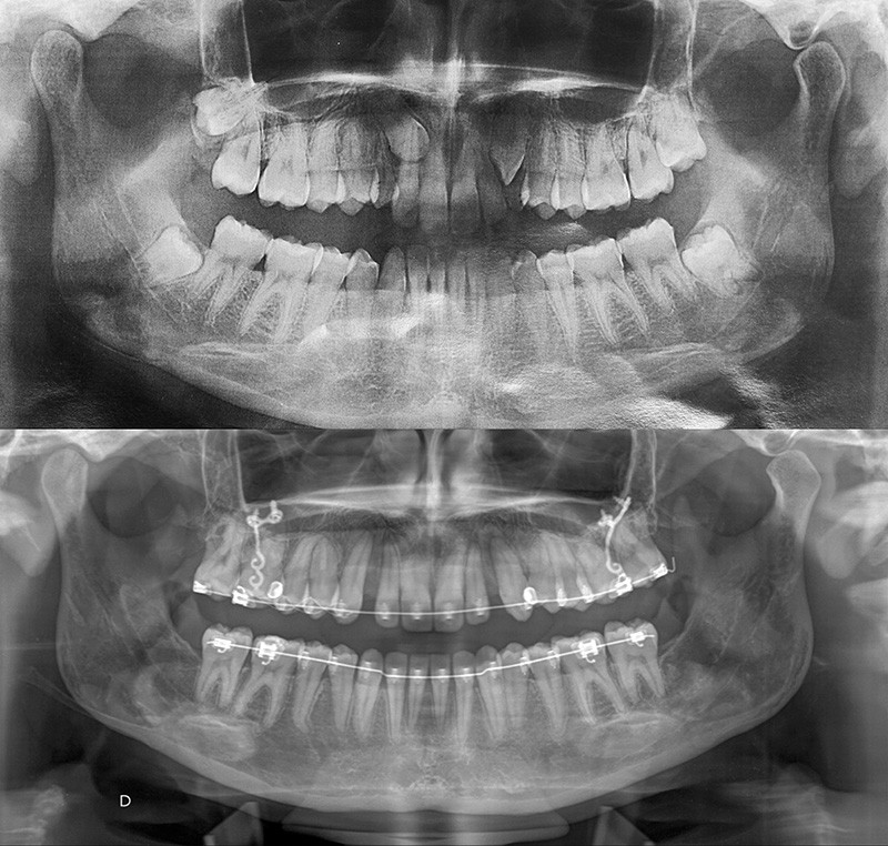 Un protocole orthodontico-chirurgical avec avancée mandibulaire est envisagé pour assurer un bon soutien labial, mais cette option est refusée par la patiente qui craint un visage trop carré. Concernant l’inclusion des canines maxillaires définitives, plusieurs thérapeutiques sont envisageables : 53, 63, 13, 23, ou 53, 63, 14, 24 peuvent être extraites, avec pour conséquence une classe II thérapeutique au niveau des molaires en fin de traitement. Cependant, la patiente souhaite mettre en place ses canines incluses pour conserver tout son capital dentaire et rétablir un idéal fonctionnel et esthétique au niveau des dents antérieures (fig. 2).