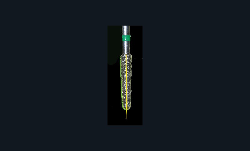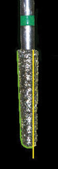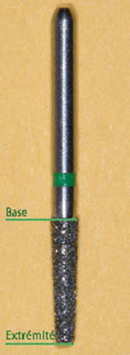 Les formes des fraises coniques à bout rond et coniques à angle interne arrondi répondent aux exigences de profil de limite cervicale de l’ensemble des matériaux de restauration prothétique. La fraise conique à bout rond est théoriquement utilisée sur la moitié de son extrémité et la fraise conique à angle interne arrondi sur les trois quarts de son extrémité pour éviter les becs de sortie de limite cervicale (Fig. 2, 3).