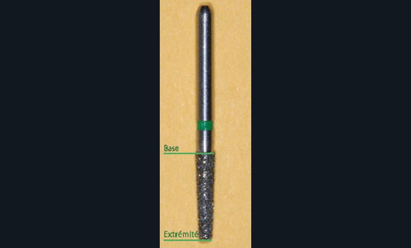 Ces réflexions ont motivé plusieurs opérateurs à réaliser des préparations périphériques sur des dents en ivoirine 46, 44, 31, 11 et 21 sur modèles Frasaco à l’aide de fraises diamantées de formes coniques (à angle interne arrondi et à bout rond) et de dimensions choisies (Fig. 1).