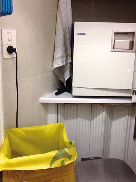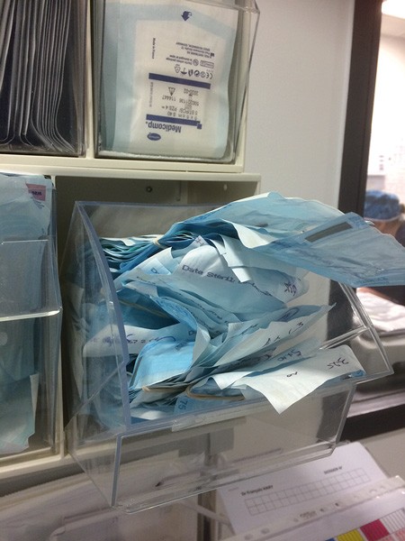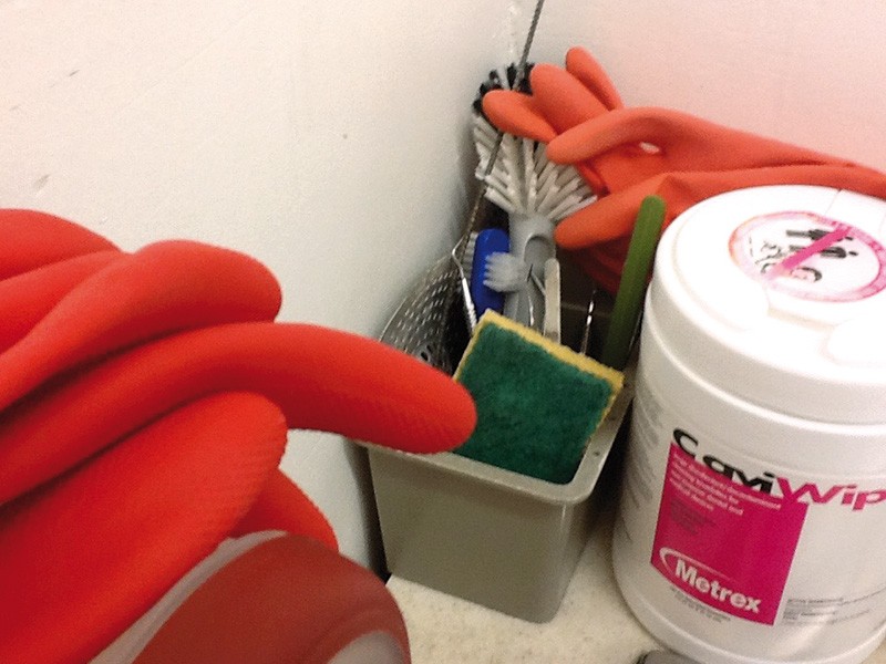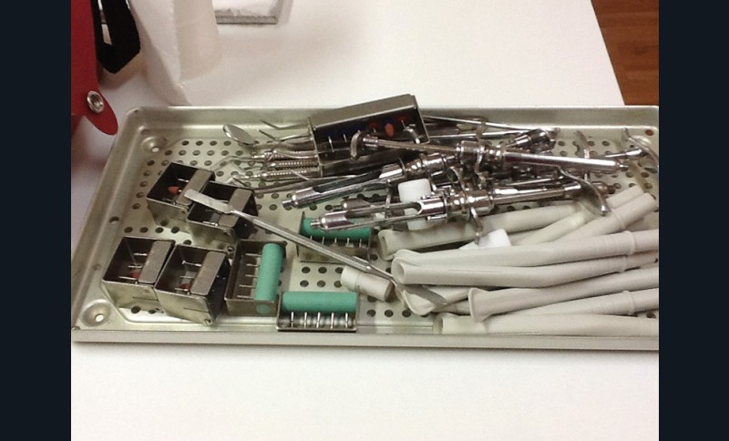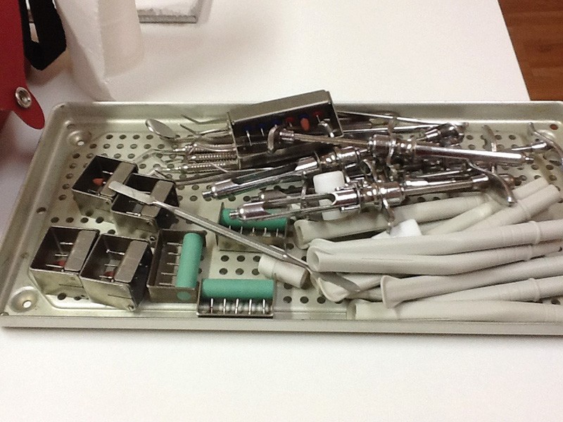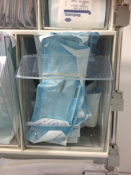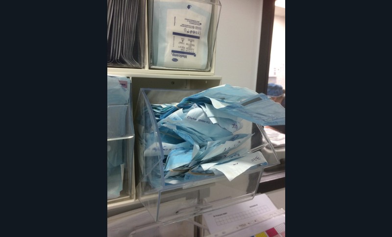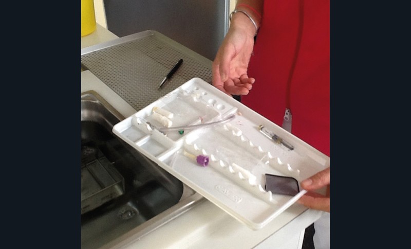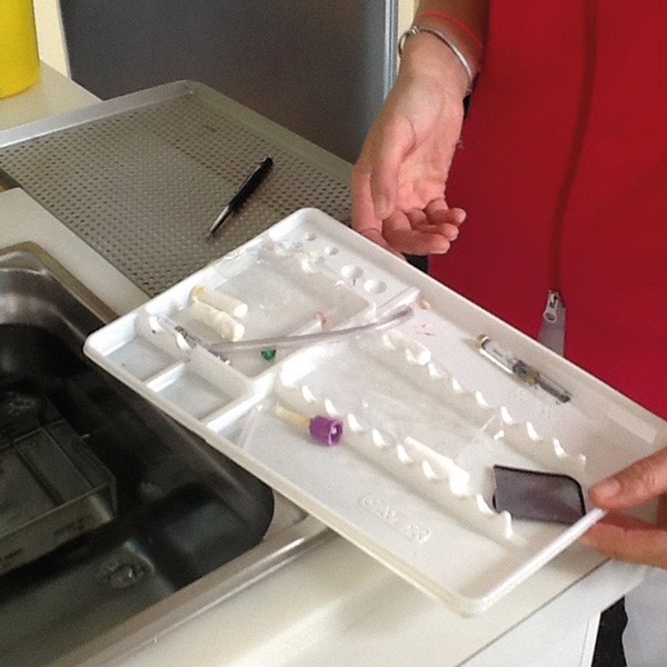 La mise en place d’un bac de décontamination en salle de soins permet l’immersion du matériel potentiellement contaminé ! Il en existe des pas trop moches… et en plus on respecte la procédure de traitement des instruments.