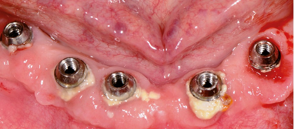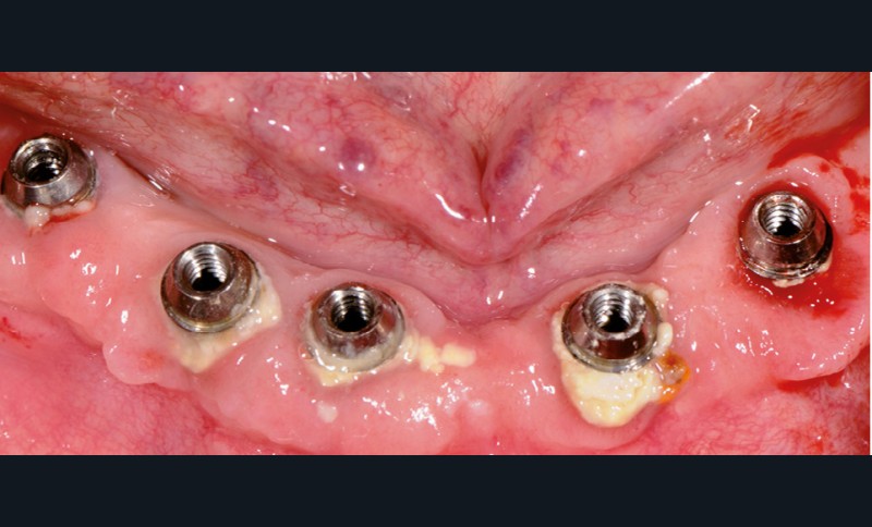 Lors de la pose d’une prothèse scellée, tout débordement de ciment doit être évité et contrôlé (radiographie rétro-alvéolaire) et, le cas échéant, soigneusement éliminé [5-10].