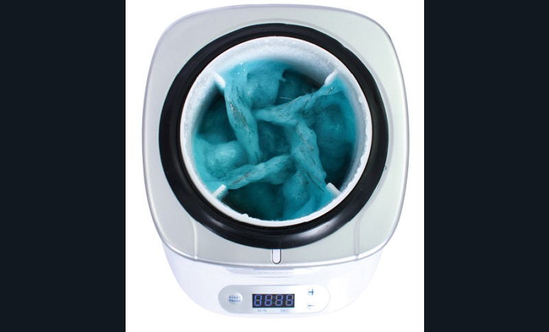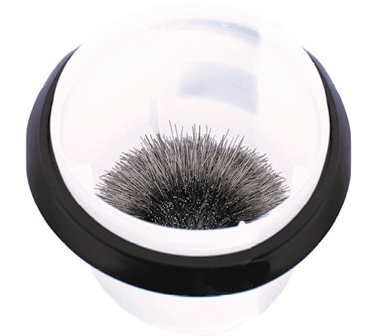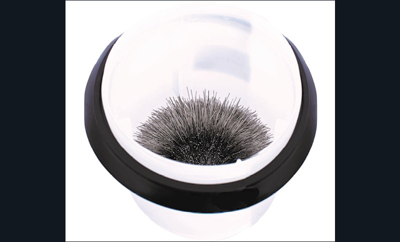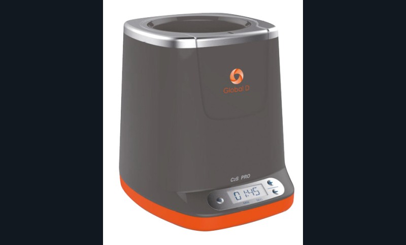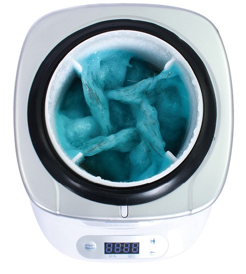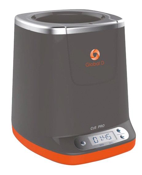Une fois retirée, la prothèse peut être nettoyée dans deux types d’appareils. Les premiers sont les appareils à ultrasons professionnels, destinés aux prothésistes, puissants, dont le bac est non autoclavable (risque de contamination croisée). Les seconds sont les appareils utilisant le principe de la tribologie : le nettoyage s’effectue par le frottement d’aiguillettes de métal (mises en mouvement par des aimants) dans un bol contenant la prothèse ainsi qu’une solution détergente ; ce qui permet un nettoyage sécurisé sans abîmer la prothèse (fig. 9 à 11). Le cycle de nettoyage dure de 15 à 20 minutes selon le degré de salissure de la prothèse à traiter. Dans le cadre de notre pratique, nous avons testé deux systèmes présents sur le marché, notre choix se portant sur le dispositif proposé par Global D (fig. 12) qui, grâce à un système d’ailettes, diminue la consommation d’aiguillettes. Cela permet un usage unique de celles-ci et évite de ce fait toute contamination croisée. De plus, le bol est stérilisable.