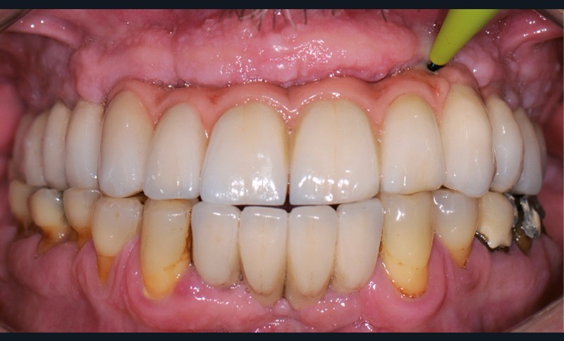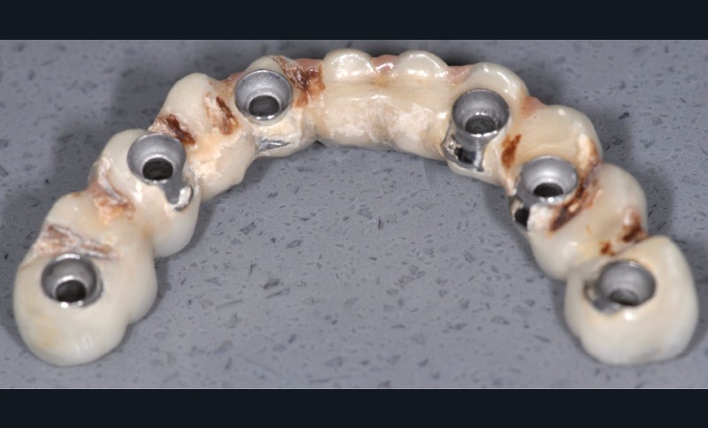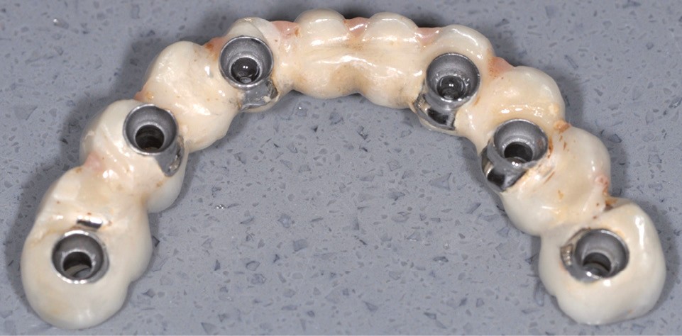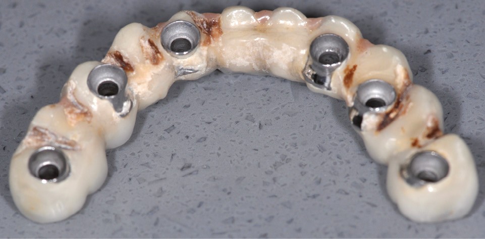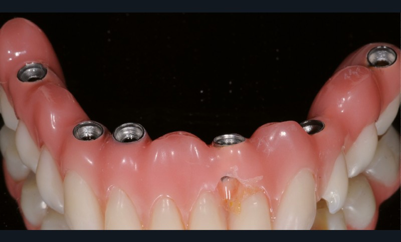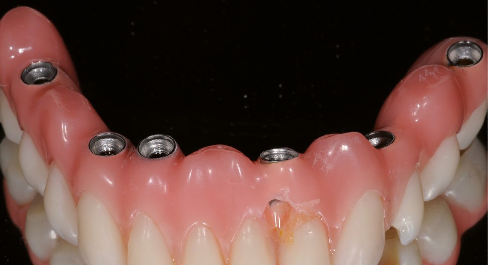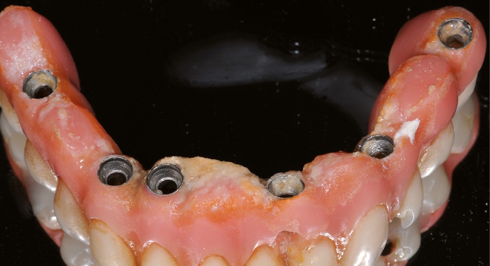 La maintenance est facilitée par la possibilité de démonter les prothèses. Quand elles ne sont pas transvissées, elles doivent être scellées provisoirement afin d’être déposées facilement. Dans le cas d’une prothèse indémontable, il est parfois nécessaire d’utiliser une fraise diamantée pour augmenter une embrasure ou un espace sous un bridge, mais la difficulté de repolir parfaitement la zone retouchée risque de favoriser l’accumulation de plaque dentaire (fig. 7 et 8), et donc l’inflammation péri-implantaire. Cependant, l’obtention d’un meilleur accès à l’hygiène compensera ce risque au prix d’un entretien quotidien rigoureux.