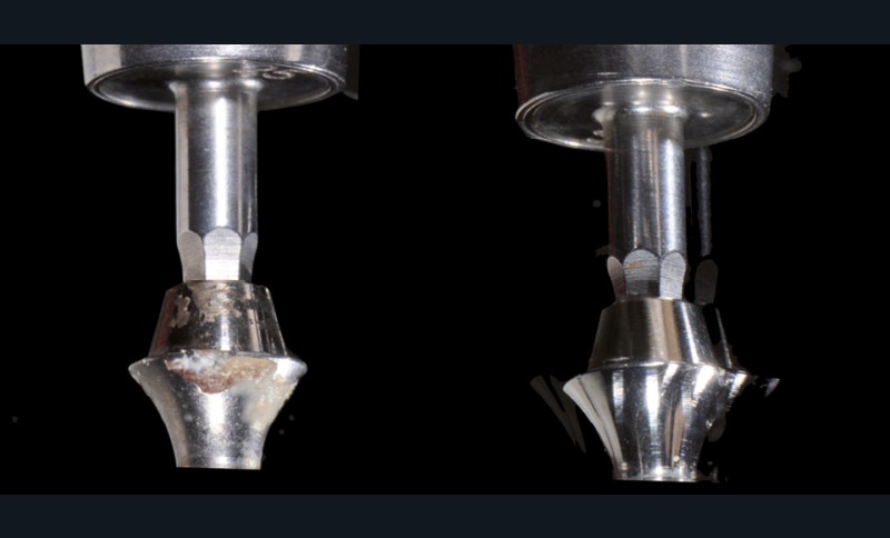 Enfin, il est important de souligner que dans le cadre du traitement d’une mucosite ou en présence d’une péri-implantite débutante, il ne faut pas se limiter au nettoyage de la partie émergente du pilier, mais désinfecter également sa partie inférieure qui est souvent infra-gingivale. Il faut alors démonter le pilier, le placer dans le même appareil pour retrouver une surface dite en poli-miroir (fig. 15). Toutefois, il est important de ne mettre qu’un pilier dans le système pour éviter les chocs entre deux éléments prothétiques qui pourraient entraîner une modification de la surface. Enfin, rappelons que le démontage du pilier en cas d’inflammation n’affecte pas l’attache épithélio-conjonctive puisqu’elle a déjà disparu.