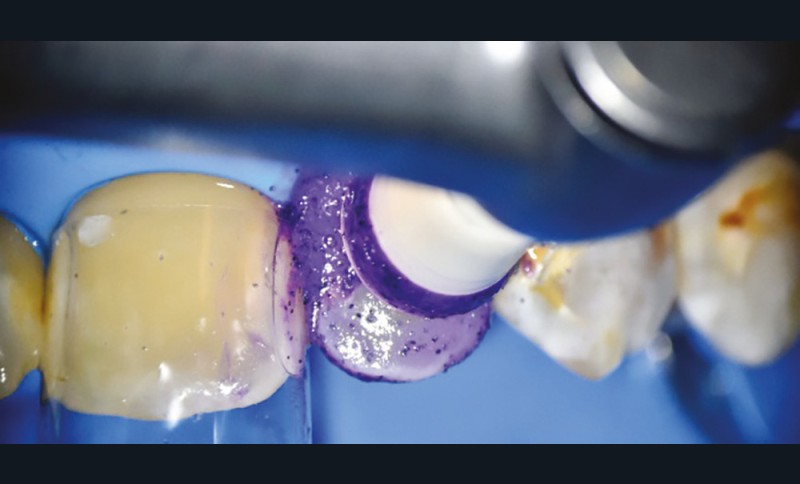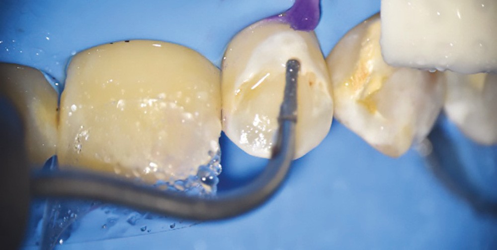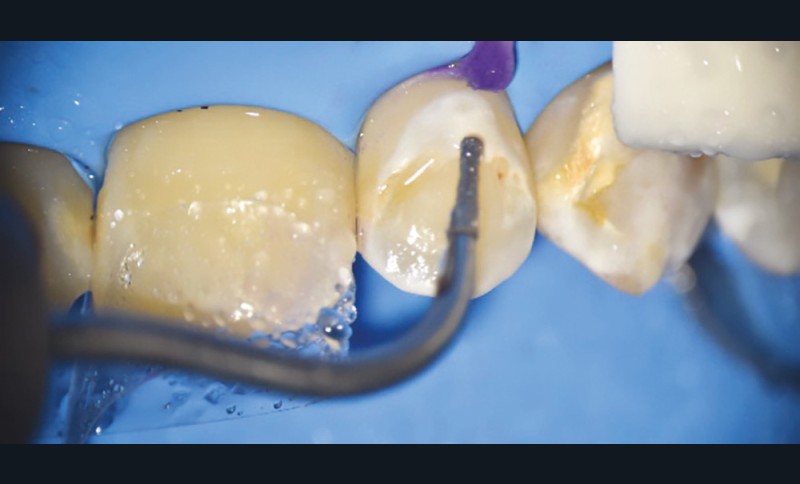 • Traitement micro invasif : il s’agit essentiellement de l’érosion/infiltration (fig. 5), mais une alternative peut également être utilisée pour les mêmes indications : le traitement de micro abrasion (fig. 6). L’indication première de cette technique est d’arrêter la progression des lésions carieuses non cavitaires lors d’une déminéralisation de l’émail (ICDAS 2) ou cavitaires au niveau de l’émail sans déminéralisation de la dentine sous-jacente (ICDAS 3) d’un patient à faible risque carieux.