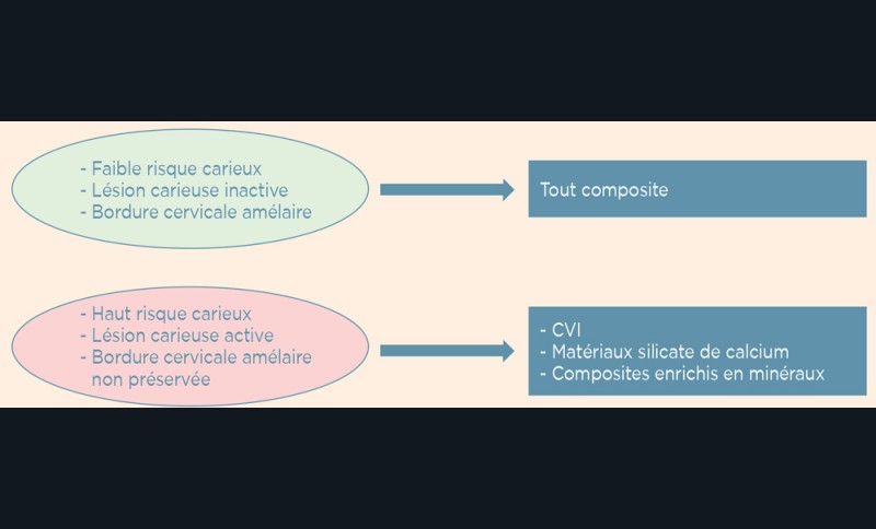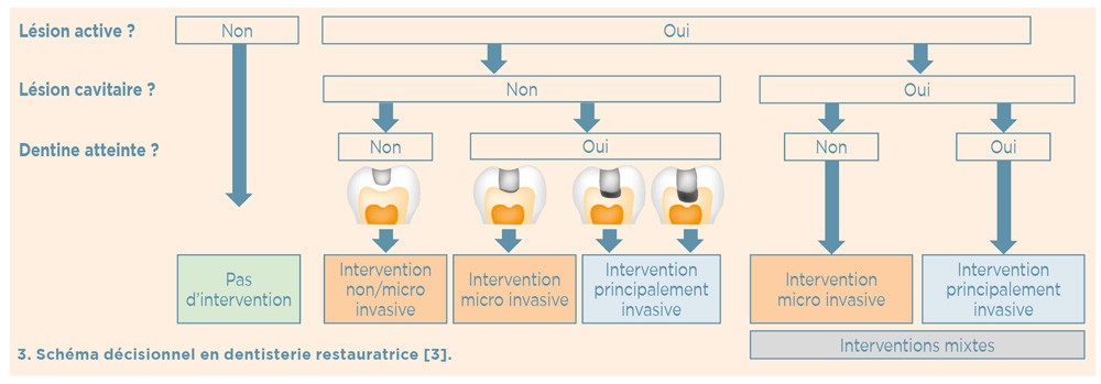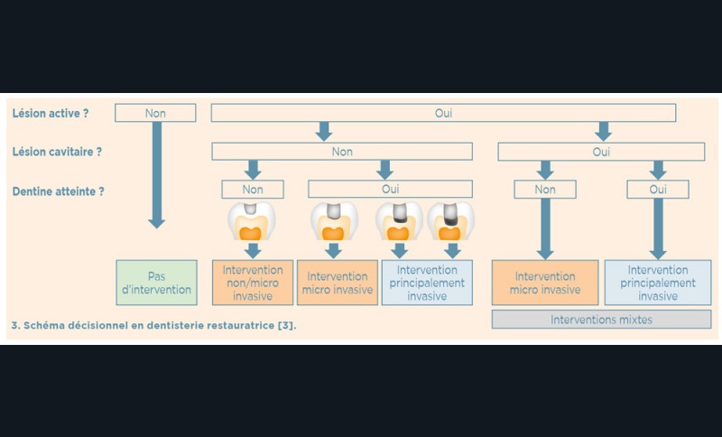 Le choix de la prise en charge de la lésion carieuse dépend de trois critères fondamentaux : l’activité de la lésion carieuse (active ou arrêtée), la présence ou non de cavitation et l’accessibilité (site proximal difficile d’accès) (fig. 3).