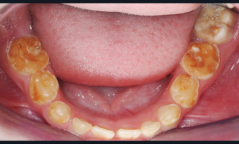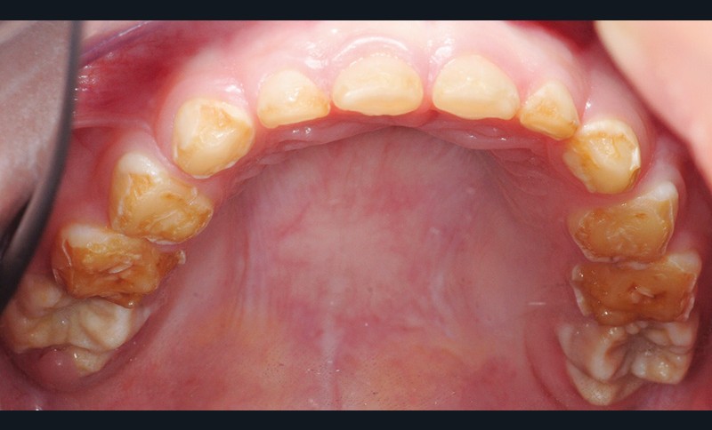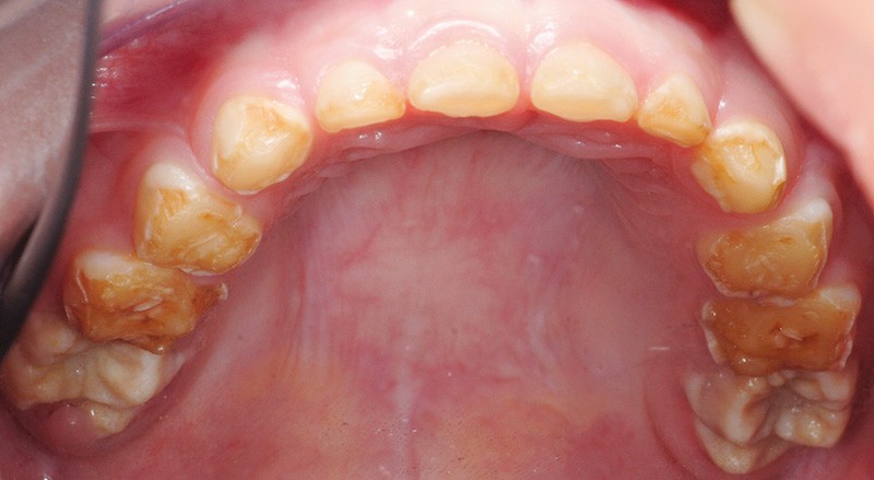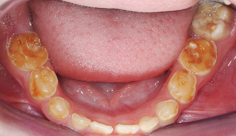 • entraîne une coloration jaune orangée de l’émail sur toute la surface coronaire ;