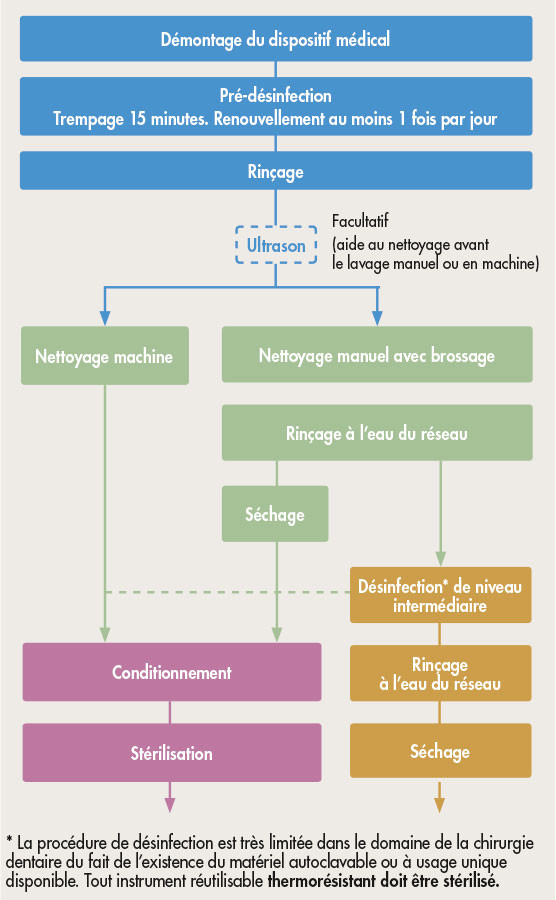 La fréquence de renouvellement des solutions est différente selon les produits utilisés : elle est généralement quotidienne et dès que le bain est sale (aspect trouble). Elle dépend de la quantité de DM immergés et de leur charge protéinique. Les bains sales sont ceux qui ont perdu leur efficacité et peuvent même de devenir contaminants [4].