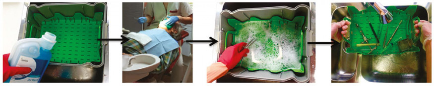 La pré-désinfection (PD) correspond à l’immersion totale dans un bac de décontamination contenant une solution détergente-désinfectante de tous les dispositifs médicaux (DM) réutilisables lors du soin chez le patient. Elle doit être exécutée le plus rapidement possible après le soin et au plus près du fauteuil [3]. Après le temps de trempage (temps variable selon la concentration, se référer aux consignes du fabricant), le rinçage des DM à l’eau courante à l’aide du panier amovible permet d’éliminer les restes de produits chimiques qui pourraient endommager définitivement les instruments. Les DM sont ensuite transvasés dans la cuve à ultrasons ou dans les paniers du laveur-désinfecteur. Il convient alors de vérifier l’état de propreté du bain et le changer éventuellement [4] (fig. 2).