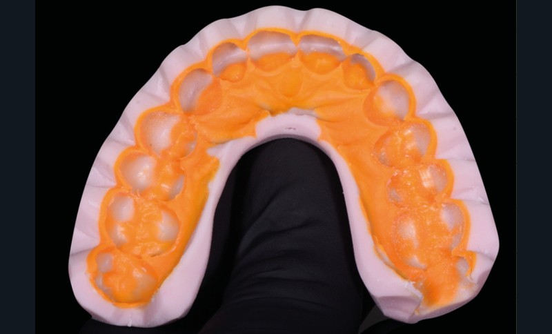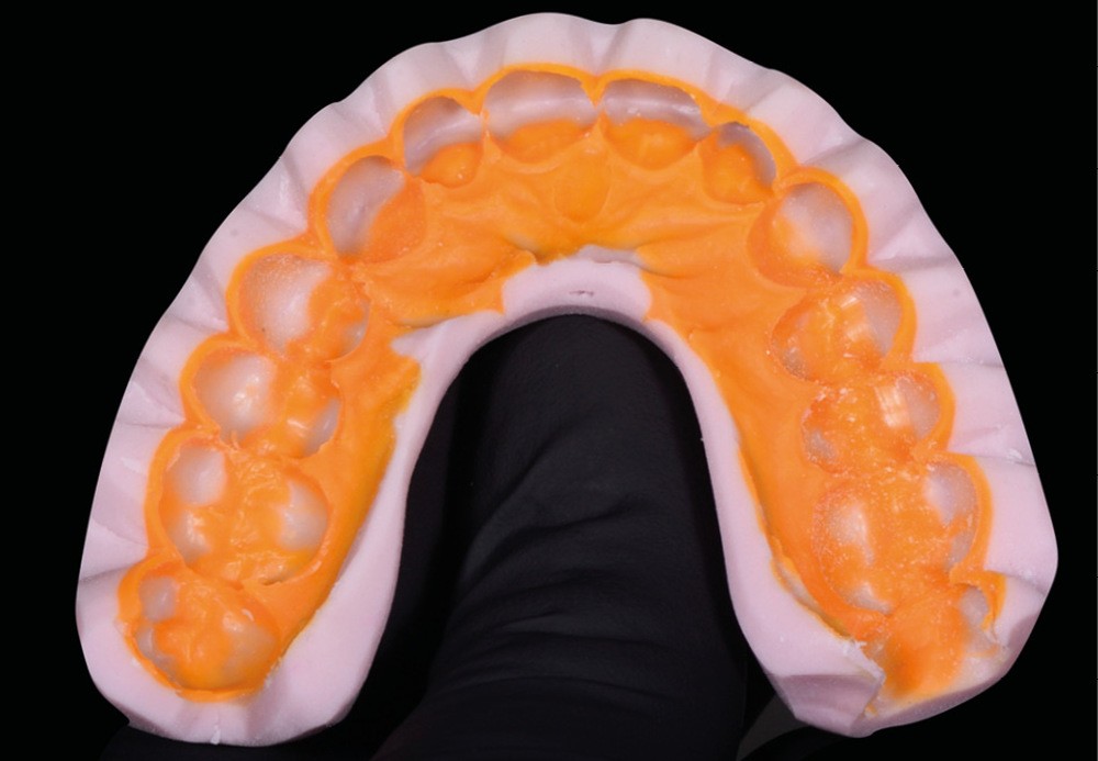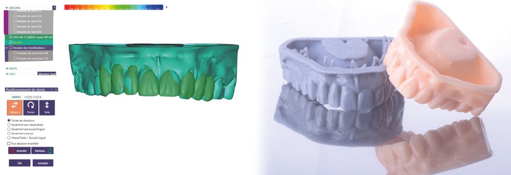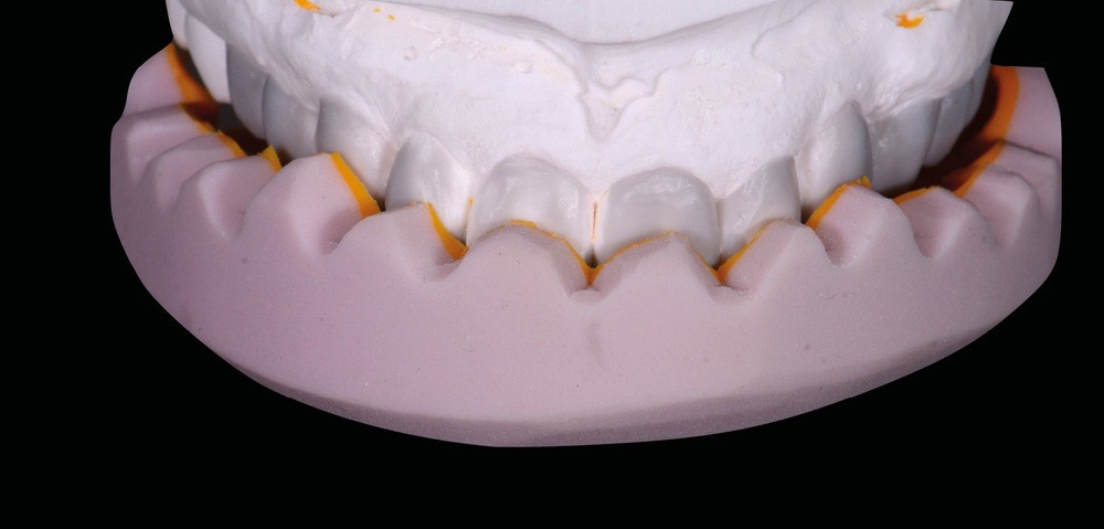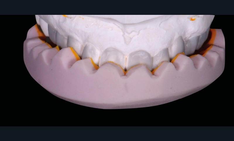 Les mock-up sont des masques de résine bis-acryl obtenus à partir de clés en silicone de haute précision. Ils sont apparus avec les progrès de l’analyse initiale et de la planification. L’analyse esthétique et fonctionnelle passe le plus souvent par la réalisation d’un wax up numérique (fig. 1) ou physique (fig. 2). Le modèle dont est tirée la forme des mock-up est généralement celui du wax-up. Ce dernier peut être transféré en bouche à l’aide d’une clé en silicone de haute viscosité (fig. 3).