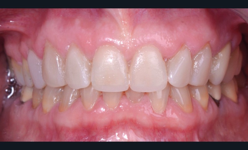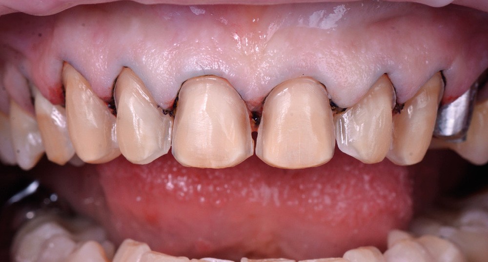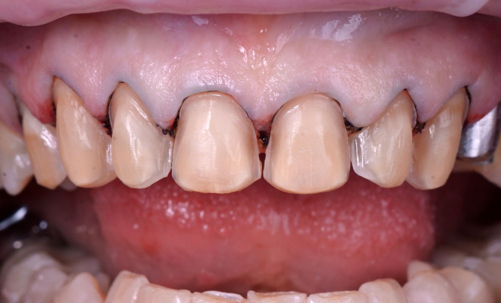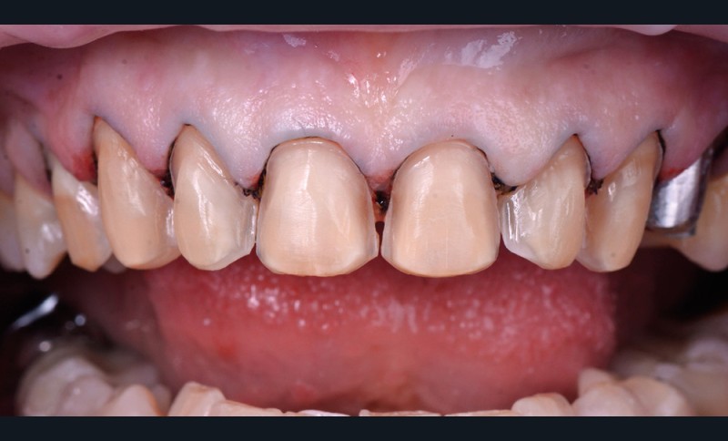 Cette maquette de résine bis-acryl (voir encadré page suivante), initialement destinée à l’analyse esthétique, peut être utilisée pour la temporisation comme restauration provisoire. Elle est alors disposée sur la surface des dents après réalisation des préparations. Elle n’est pas nécessairement scellée et peut être maintenue uniquement grâce au remplissage des zones proximales. Dans le secteur antérieur, la courbe de l’arcade permet de générer des contre-dépouilles entre les restaurations qui assurent la bonne tenue de l’ensemble. Il s’agit alors d’une restauration provisoire plurale solidarisée (fig. 4).