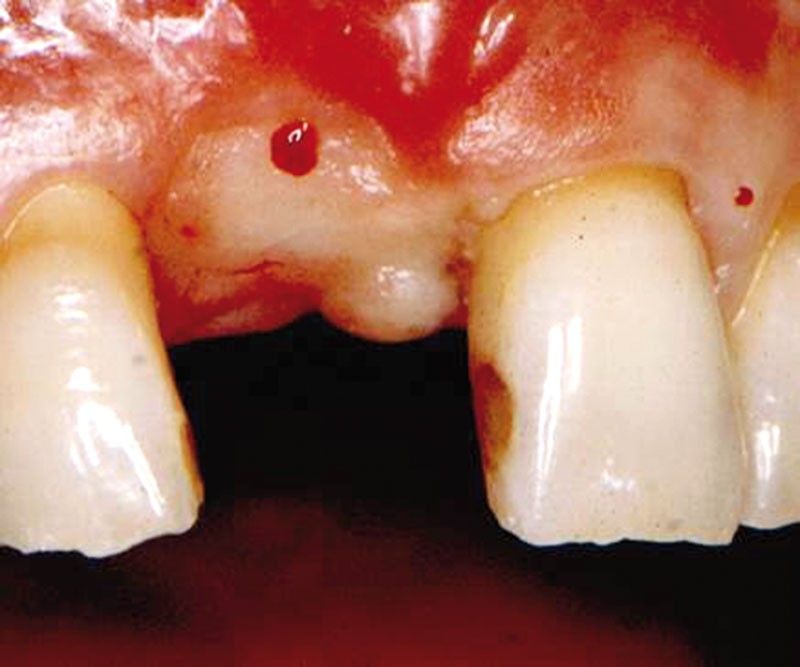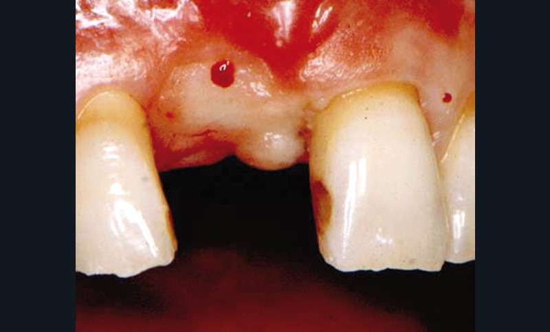 Le volume osseux résiduel était suffisant pour placer un implant en bonne position sans utiliser des techniques de régénération et, au bout de 6 mois, le deuxième temps chirurgical a été planifié. À ce moment-là, l’observation clinique montre une zone crestale plate entre les deux dents adjacentes avec un PIS de 0 (fig. 1, 2).
