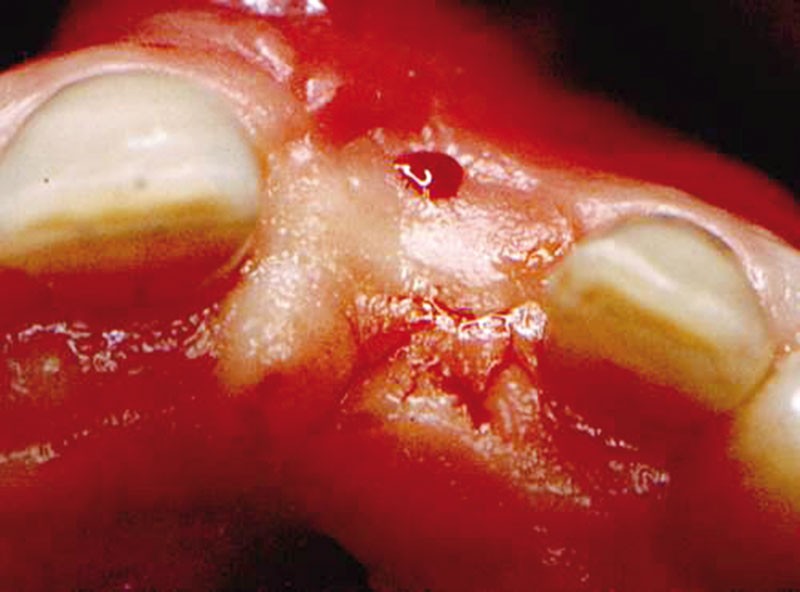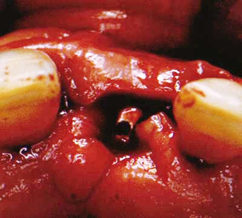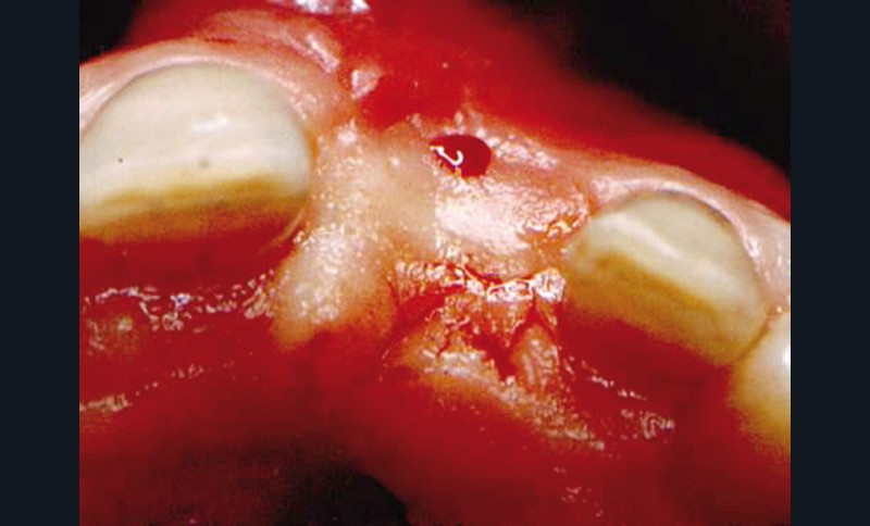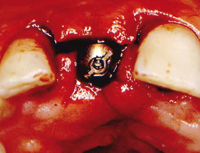 Technique chirurgicale. Après une anesthésie locale avec un vasoconstricteur (xylocaïne à 1100 000), une incision intra sulculaire partant des faces distales des deux dents adjacentes va être prolongée sur le sommet de la crête de façon à ce que la moitié vestibulaire de la vis de couverture se trouve dégagée quand le lambeau est soulevé.
