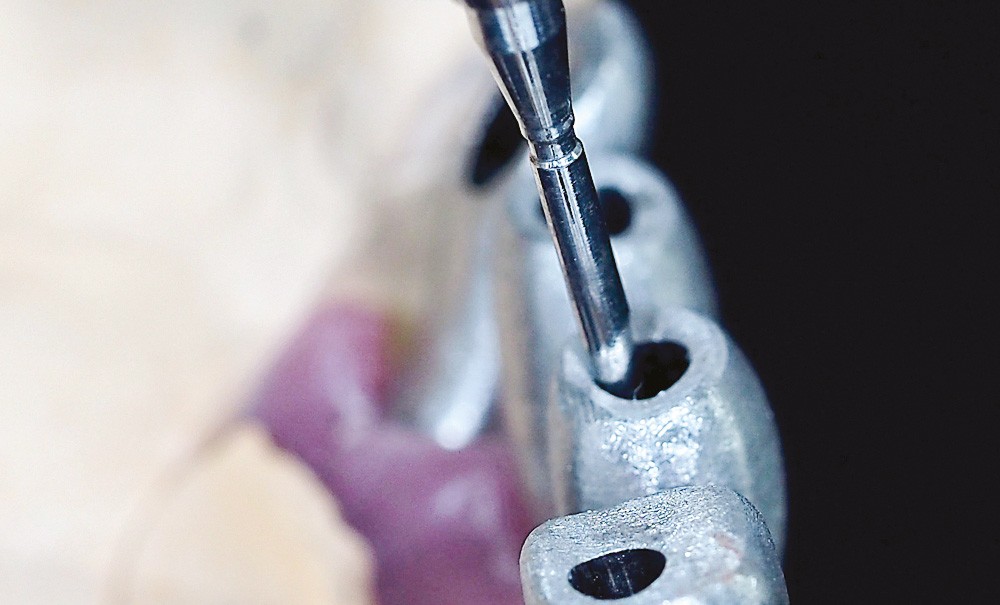 L’angulation du puits de vissage a surtout été décrit dans les réhabilitations transvissées antérieures où le positionnement d’un implant dans l’axe de la crête osseuse et non de la future prothèse impose un rattrapage de cette angulation. La possibilité de modifier l’axe du puits de transvissage fait appel à une instrumentation spécifique constituée d’un tournevis à extrémité hémisphérique de forme hexagonale s’utilisant avec des vis spécifiques à tête modifiée. L’architecture spécifique du puits d’accès, plus large pour recevoir la vis et permettre un vissage décentré par rapport à l’axe implantaire, impose une conception et la réalisation des armatures exclusivement par CFAO.