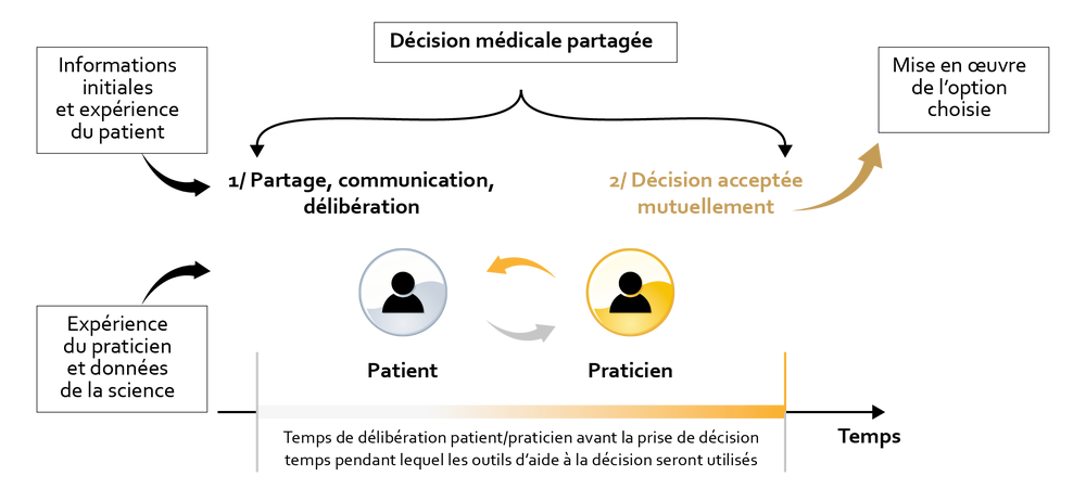 Une analyse rétrospective de la relation médecin-malade rend compte d’un certain déséquilibre ayant persisté de nombreuses années. Le praticien était alors dans une position haute, une posture de « sachant » détenant le pouvoir, le savoir et l’information. A contrario, le patient occupait bien souvent une position basse, fréquemment contraint d’accepter sans oser protester. Ce type de modèle paternaliste [1] est aujourd’hui suranné. Il a laissé place à un modèle de décision médicale partagée, qui met en avant un contrebalancement à travers un partage du pouvoir entre les acteurs. Il redonne une place privilégiée au patient ainsi qu’à ses préférences et ses valeurs [HAS 2013] pour aller vers une démarche consensuelle (fig. 1).