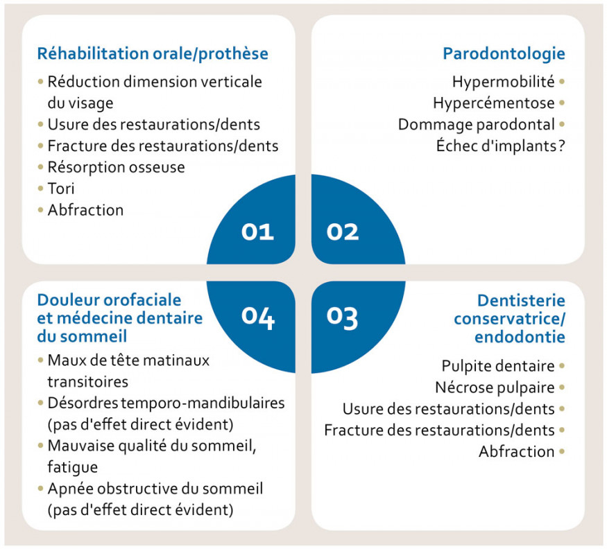Le bruxisme du sommeil peut engendrer une pression importante sur les dents et les restaurations, sur le parodonte, et possiblement sur les articulations temporo-mandibulaires (ATM) et les muscles de la mastication (sujet à débat) [4]. Il faut être prudent avec ces associations qui ne sont pas une évidence de cause à effet. Le bruxisme du sommeil peut mener à un large éventail de conséquences, telles que l’usure des dents (probable), des fractures dentaires (probable), de l’abfraction (débattu), une dimension verticale réduite (débattu), une hypertrophie du masséter (non spécifique), des céphalées matinales (probable et à distinguer de celles de l’apnée), ainsi que des dommages pulpaires et parodontaux (débattu) [5] (fig. 1). Cependant, même si la présence de bruxisme du sommeil serait aussi reliée à des échecs d’implants dentaires, l’association entre les deux reste incertaine ; la présence de comorbidités expliquerait en partie ces conséquences [6, 7]. On se doit de prendre avec nuance ces points, c’est-à-dire sans être trop catégorique ou affirmatif.