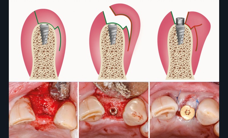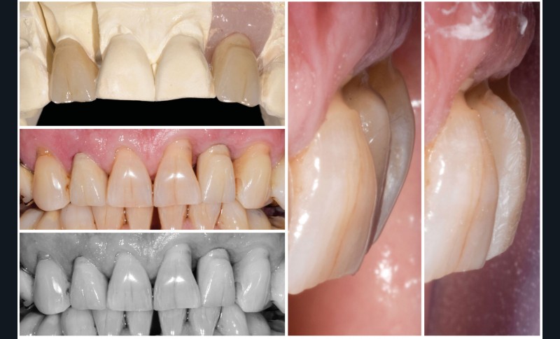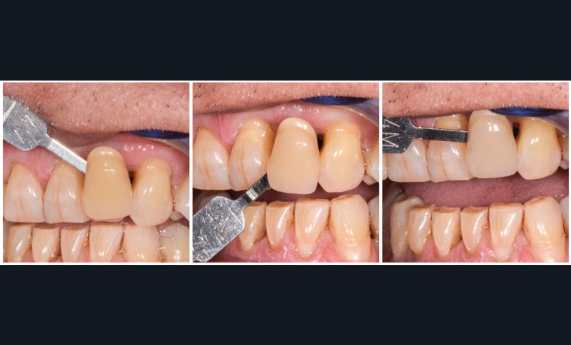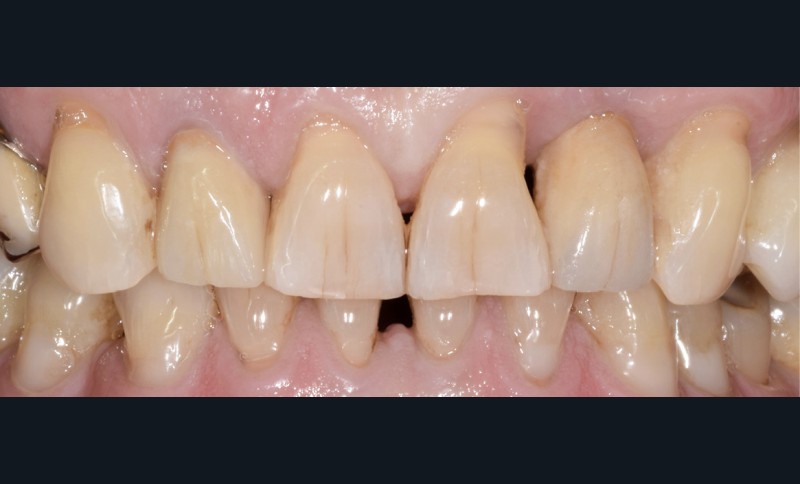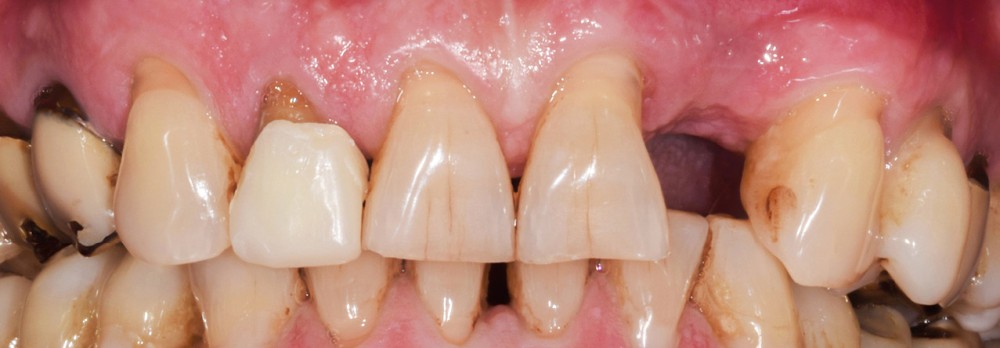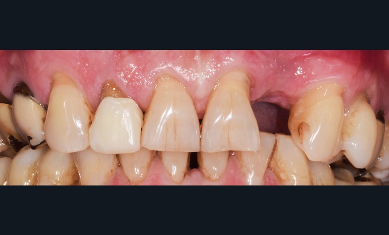 Au vu des conditions initiales, il nous apparaît impossible de restaurer une esthétique satisfaisante, notamment au niveau de l’alignement des collets, sans une chirurgie muco-gingivale associée à une réhabilitation des dents antérieures par facettes. En effet, la perte de la 22, associée à une forme triangulaire des dents, a provoqué un non-alignement des collets ainsi que la présence de trous noirs entre les dents 21-22 et 22-23. Cependant, les contraintes exprimées par le patient contre-indiquaient ce traitement.