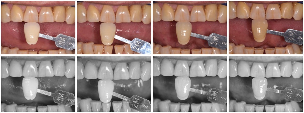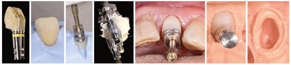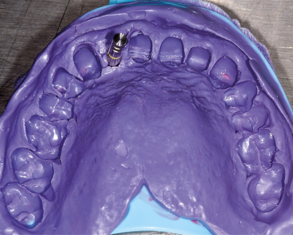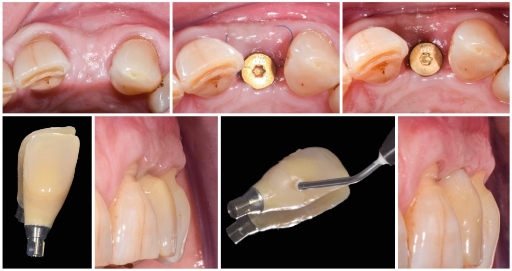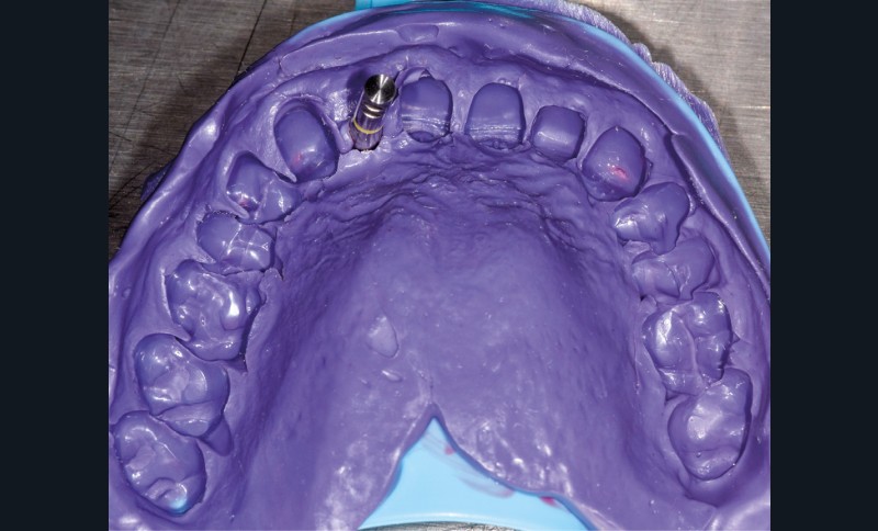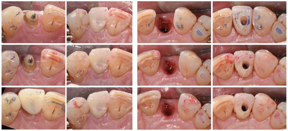 La proposition thérapeutique retenue par le patient est donc une réhabilitation par couronne céramique sur 12 (dento-portée) et 22 (implanto-portée). Ce choix thérapeutique impose de concevoir des dents qui s’intègrent au mieux dans l’harmonie du sourire, tout en étant conscient des limites d’un tel traitement.