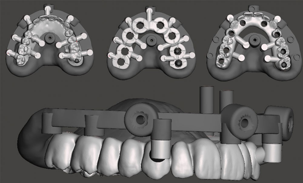 Nous présentons dans cet article l’utilisation d’un guide à étage en vue d’une réhabilitation complète implanto-portée du maxillaire chez un patient ayant bénéficié de greffes osseuses. Cette technique a été proposée par Salama et al. en 2018 [4] dans un cas d’extraction implantation et mise en charge immédiate au maxillaire. Il avait pour but de permettre une résection de crête alvéolaire guidée et conceptualisée à partir du projet prothétique réalisé numériquement. Cet outil présente également un intérêt chez les patients reconstruits en optimisant le capital osseux tout en permettant la mise en charge immédiate, au bloc opératoire, d’un bridge provisoire sans fausse gencive conçu par ordinateur [5, 6]. Il participe en ce sens à la gestion des tissus mous en favorisant un contour papillaire et pallie certains défis des protocoles traditionnels [7].