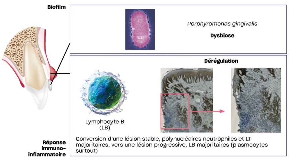 Les LB sont extrêmement nombreux au niveau des lésions parodontales avancées, notamment sous leur forme de différenciation terminale, les plasmocytes (fig. 2). Ainsi, la parodontite est caractérisée par la conversion d’une lésion stable riche en lymphocytes T (LT), vers une lésion plus progressive riche en LB [2]. La présence des plasmocytes a été associée à la persistance de l’invasion par Porphyromonas gingivalis (P. gingivalis). Les plasmocytes représentent 50 % de l’infiltrat inflammatoire et les LB environ 20 %.