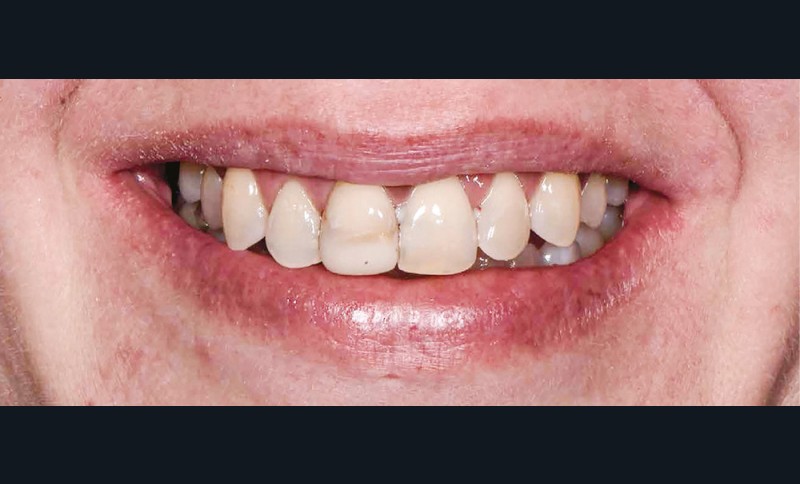 Les explications de soins sont données et un enseignement des techniques de brossage est prodigué. La patiente comprend ainsi qu’avant de lui rendre un sourire plus harmonieux, un assainissement de sa cavité buccale doit être réalisé et que le succès dépend aussi de sa motivation à entretenir au quotidien son hygiène bucco-dentaire. Les photos sont précieuses pour l’explication : voir son sourire sur un grand écran permet de visualiser les zones de rétentions alimentaires, les dysharmonies de formes et de teinte et aide grandement à la compliance du patient.