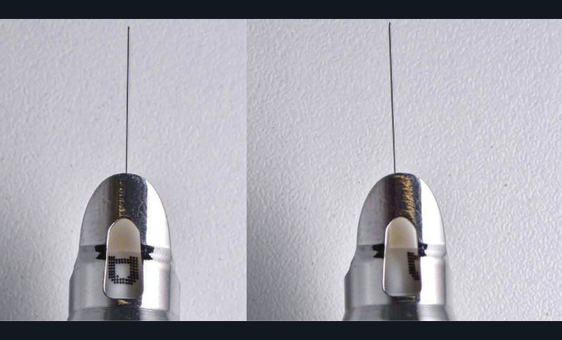 Le soin de la 25 est réalisé avec le même protocole d’anesthésie grâce une pénétration dans la papille distale facilitée par l’absence de la 26. La même carpule est utilisée et terminée. Pour anesthésier la 47, une aiguille orange de diamètre 0,40 mm permettra de passer la corticale plus dense de la branche montante de la mandibule (fig. 9). Dans cette zone, l’axe de pénétration de l’aiguille sera le même dans toutes les étapes : injection dans la muqueuse progressivement jusqu’au contact osseux puis mise en rotation pour passer la corticale puis injection d’une demi-carpule contrôlée électroniquement selon la densité de l’os trabéculaire [4].