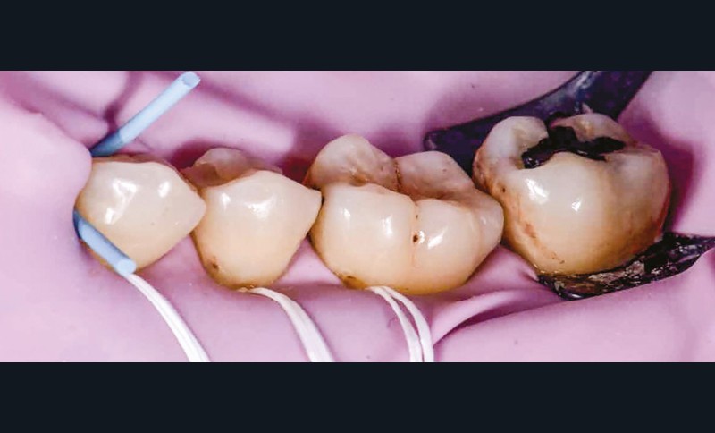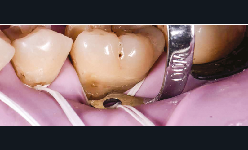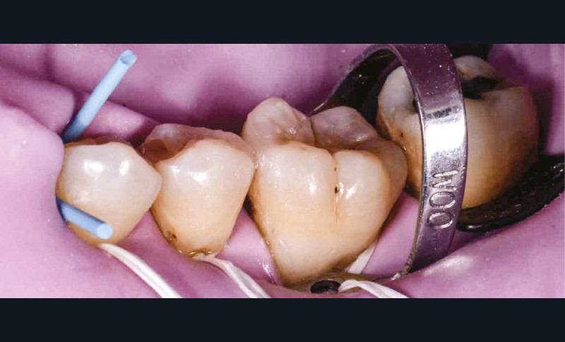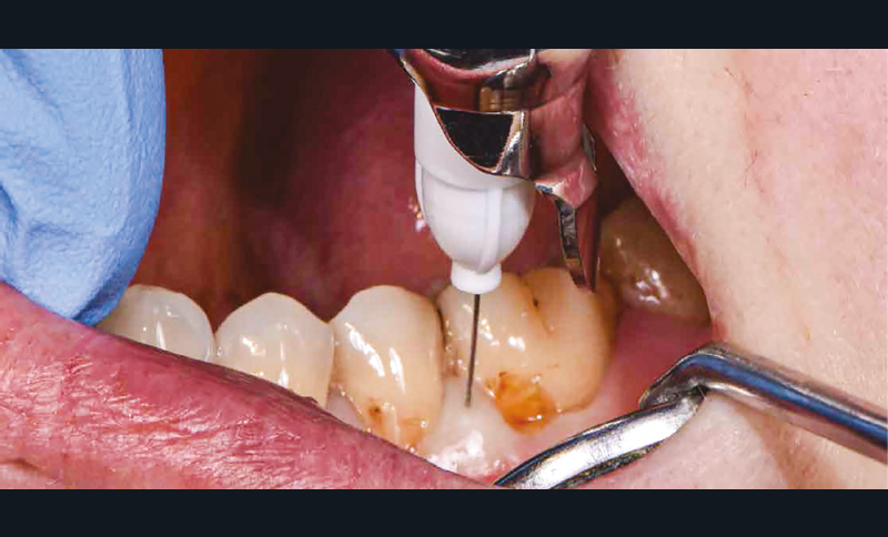 La première anesthésie se situe au niveau de la papille proximale entre 35 et 36. L’aiguille blanche de diamètre 0,30 mm et de longueur 16 mm est orientée de façon à avoir son repère légèrement décalé de la fenêtre du porte-aiguille (fig. 4). Ainsi, le biseau se pose à plat contre la muqueuse [1]. L’aiguille glisse doucement et de façon indolore dans la papille sur 2 mm et l’injection débute sans surpression sous contrôle électronique. Lorsque la papille montre une vasoconstriction suffisante, elle devient blanche et l’injection peut s’arrêter. La pièce à main s’oriente alors en direction de l’espace apical interdentaire avec un angle de 30 à 45° vestibulolingual (fig. 5). L’aiguille est mise en rotation pour pénétrer la corticale osseuse. Elle arrive ensuite dans la partie trabéculaire de l’os. Lorsque les deux tiers de l’aiguille sont sous la corticale, la rotation doit cesser et l’injection reprend avec une vitesse qui s’adapte électroniquement à la densité de l’os. Une demi-carpule d’articaïne 1/100 000 suffira à la restauration de ce secteur [2]. Le champ opératoire, le crampon, les ligatures sont placés (fig. 6) ; un crampon additionnel permet de descendre la ligature dans le sulcus de la 36 pour réaliser le soin vestibulaire (fig. 7). Les restaurations sont réalisées sans douleur (fig. 8) [3].