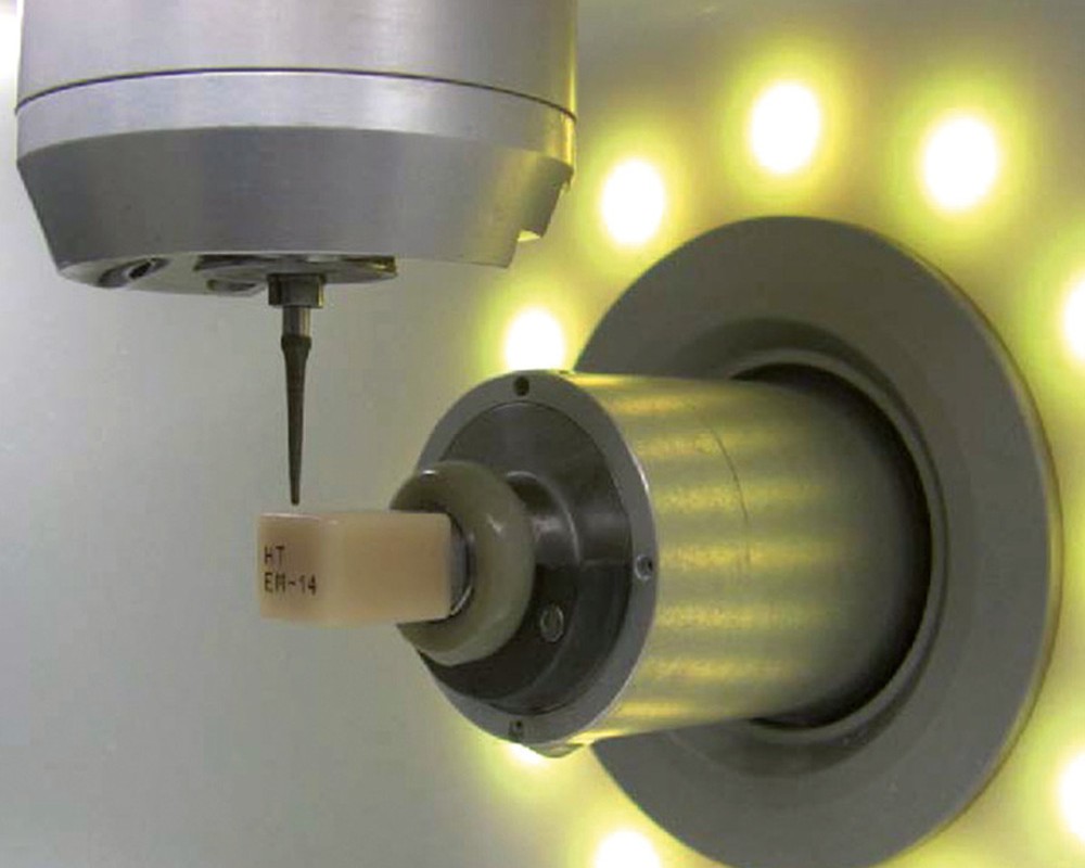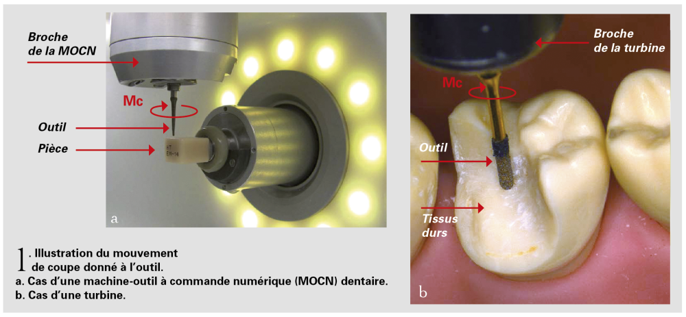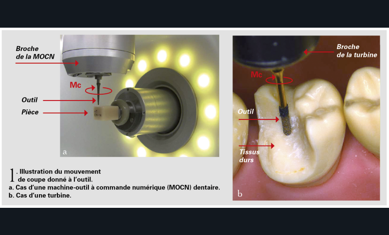 Pendant une opération d’enlèvement de matière par fraisage, c’est l’outil (instrument) qui est animé du mouvement de coupe. Ce mouvement, noté Mc, correspond au mouvement de rotation donné à l’outil autour de son axe (fig. 1). Il lui permet d’usiner la pièce prothétique dans la zone de contact outil/matière. Le mouvement de coupe est caractérisé par la vitesse de rotation (exprimée en tr/min ou RPM, revolutions per minute en anglais) de l’outil (fraise/instrument) autour de son axe. Le mouvement de coupe est généré par un moteur électrique dans le cas d’une machine-outil à commande numérique (MOCN) dentaire, ou par de l’air comprimé lorsqu’il s’agit d’une turbine. Les pièces à main existent en version électrique et pneumatique.
