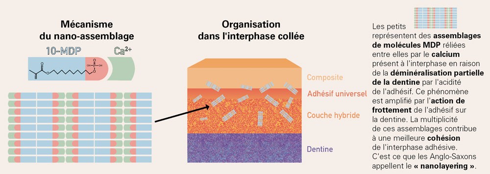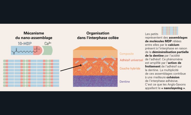 Ces propriétés permettent au 10-MDP de s’autoassembler en un réseau tridimensionnel de nano-couches à l’interface adhésif-dent : c’est ce qu’on appelle le « nanolayering » ou nano-assemblage.