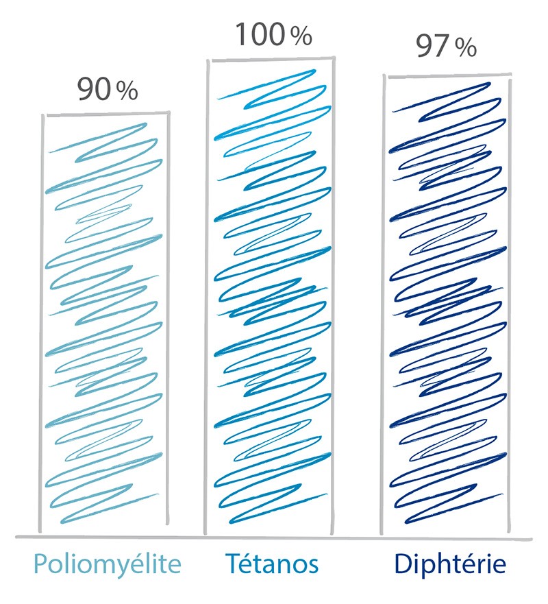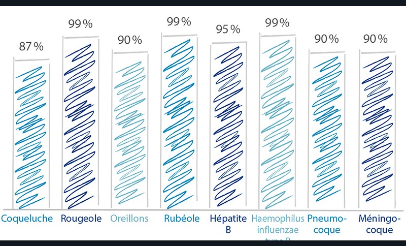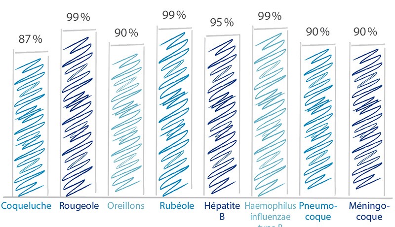 Actuellement, en France, l’efficacité des vaccins contre la polio, le tétanos et la diphtérie (maladies pour lesquelles ils sont obligatoires) est tout à fait satisfaisante (tabl. I). Il en est de même pour les vaccins systématiquement (coqueluche) ou quasiment systématiquement (Hib) combinés avec ceux obligatoires. En revanche, la couverture vaccinale contre les autres maladies est notoirement trop faible, entraînant des décès et des séquelles pourtant évitables et ne permettant pas, entre autres, l’élimination de la rougeole (fin 2017, l’agglomération de Bordeaux a d’ailleurs été confrontée à une épidémie de rougeole). La France est aujourd’hui l’un des pays au monde où la défiance vaccinale est la plus forte.
