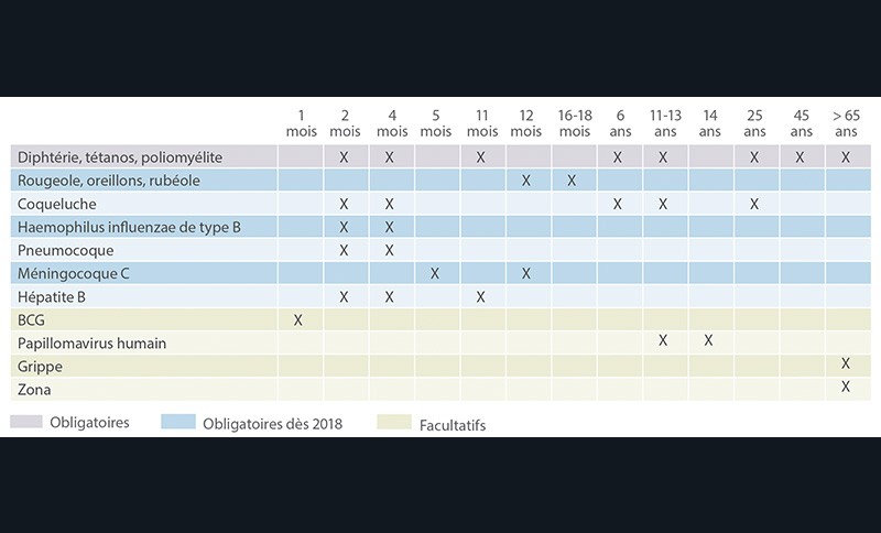 Depuis le 1er janvier 2018, les enfants de moins de 2 ans doivent être vaccinés contre 11 maladies pour pouvoir accéder à la « société », c’est-à-dire pour l’entrée en crèche, à l’école, en garderie, en colonie de vacances ou dans toute autre collectivité (tabl. II et III). Ces vaccins peuvent être faits jusqu’aux 18 mois de l’enfant, s’il n’est pas gardé dans ce type de collectivités avant cela.