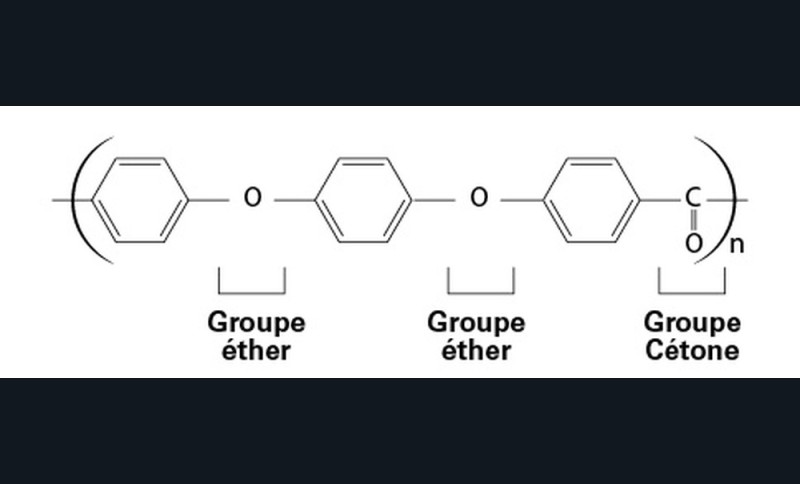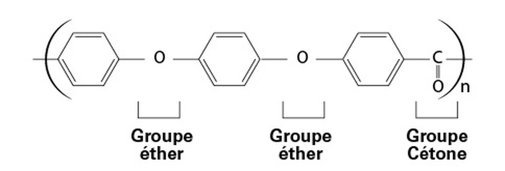 Cette dénomination rébarbative correspond tout simplement à un polymère aromatique à chaîne linéaire rigide. C’est-à-dire une association de noyaux aromatiques (cycles benzéniques) constituant une chaîne carbonée, liés entre eux par des groupes éthers (atomes d’oxygène) et cétones (groupes carbonyles), de formule (-C6 H4 -OC6 H4 -O-C6 H4 -CO-)n. Il y a deux fois plus de groupes éthers que de groupes cétones (Fig. 1).