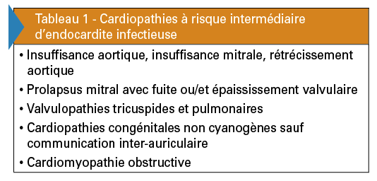 Le risque d’endocardite infectieuse dépend de la cardiopathie sous-jacente, ce qui conduit à distinguer des patients à risque intermédiaire et à risque élevé d’endocardite. Les cardiopathies exposant à un risque intermédiaire d’endocardite sont pour la plupart des valvulopathies natives et des cardiopathies congénitales avec shunt gauche-droit (tableau 1).