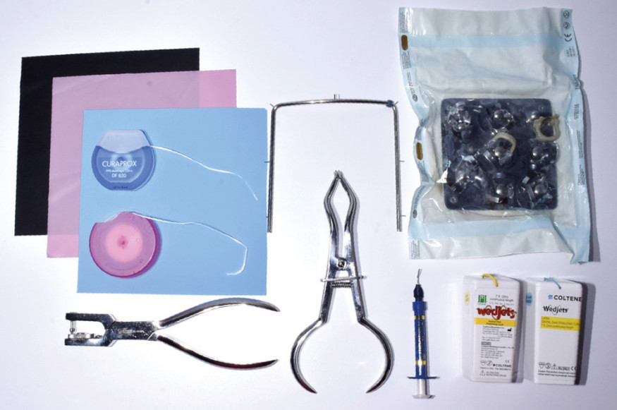 Communément appelé digue, le champ opératoire est une feuille de latex étanche permettant d’isoler une ou plusieurs dents du reste du milieu buccal. Son utilisation nécessite un certain nombre d’équipements (fig. 1).