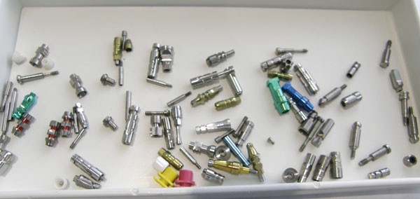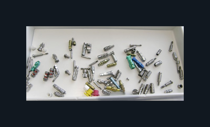 Matériel nécessaire : clé, tournevis, extracteur, analogue et transfert dont il existe presque autant de modèles que de types d’implants (fig. 2 et 3). L’assistante consultera le dossier du patient afin de sélectionner les pièces adaptées au pilier implanté.