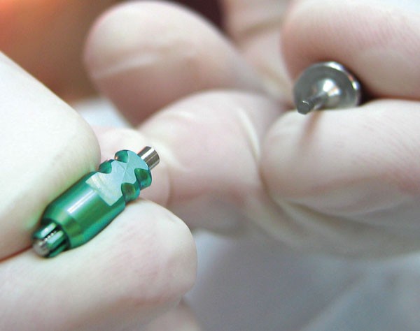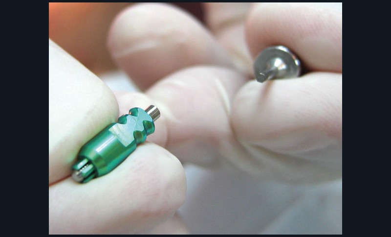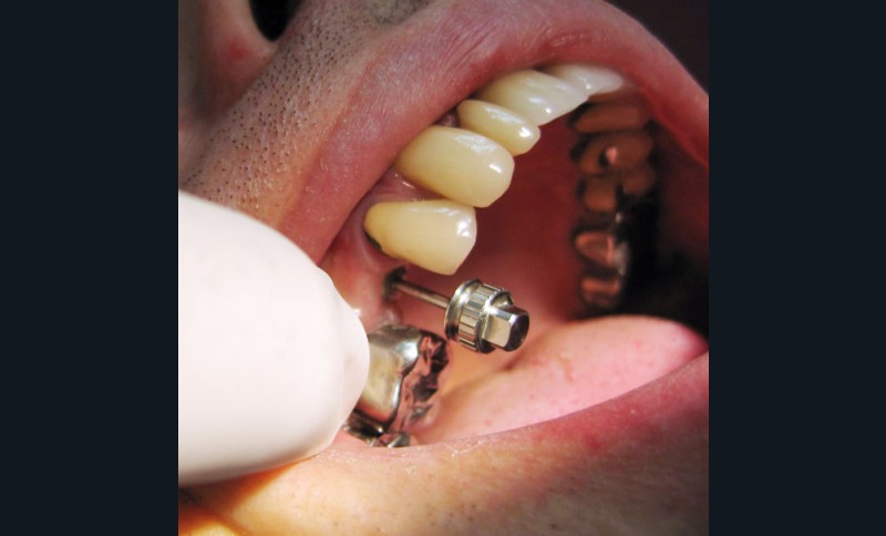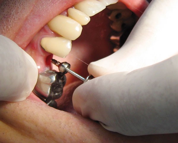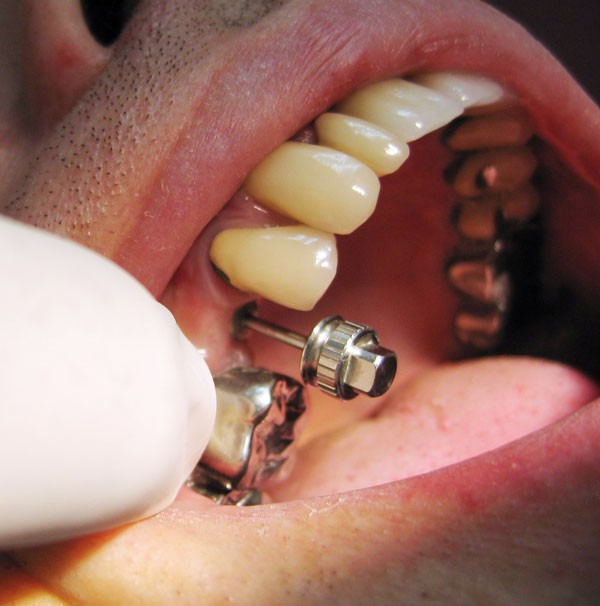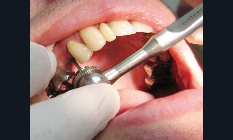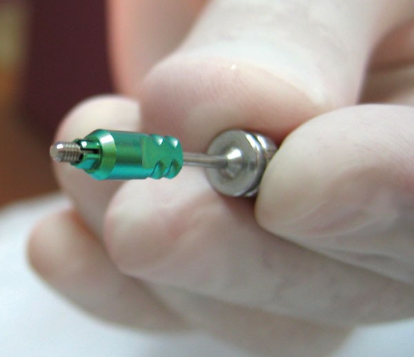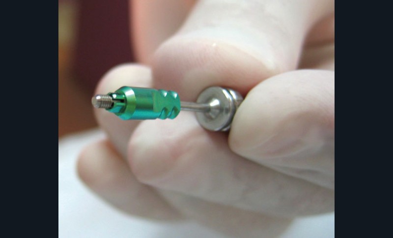 Dépose de la vis de cicatrisation (fig. 4) : l’assistante présente au praticien l’embout du tournevis adapté à la tête de vis de cicatrisation (fig. 5).