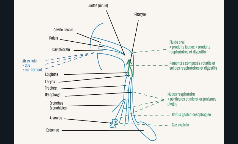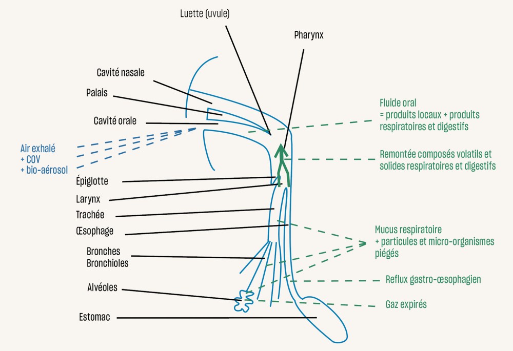 Le souffle est généré naturellement par les poumons en tant que flux expiratoire du CO2, récupéré dans le sang capillaire au niveau des alvéoles pulmonaires et des gaz non passés dans le sang (azote, CO2 …). Les voies aériennes inférieures, dites respiratoires, conduisent ce gaz vers les voies aériennes supérieures (bronchioles, bronches, trachée) avant de rejoindre le carrefour aéro-digestif puis les cavités buccale et nasale. Mais il existe bien entendu un flux inspiratoire (10 à 12 000 l par 24 heures) qui véhicule l’air ambiant, garant de l’apport indispensable en oxygène. L’air ambiant peut contenir de très nombreuses particules (jusqu’à 100 milliards) potentiellement toxiques, des micro-organismes, des gaz nocifs. Afin de se protéger de ces éléments agressifs, les voies aériennes sécrètent par leurs cellules caliciformes de surface et leurs cellules des glandes muqueuses sous-jacentes un hydrogel extracellulaire, le mucus [4]. Celui-ci est constitué d’eau (97 %), de lipides, de sels minéraux et majoritairement de glycoprotéines muqueuses hautement glycosylées, MUC5B et MUC5AC (mucines) ; d’autres mucines (MUC1, MUC4, MUC16 et MUC20) restent liées aux cils tapissant les voies aériennes. Le mucus sécrété piège les particules et les micro-organismes et dissout les gaz nocifs [11].