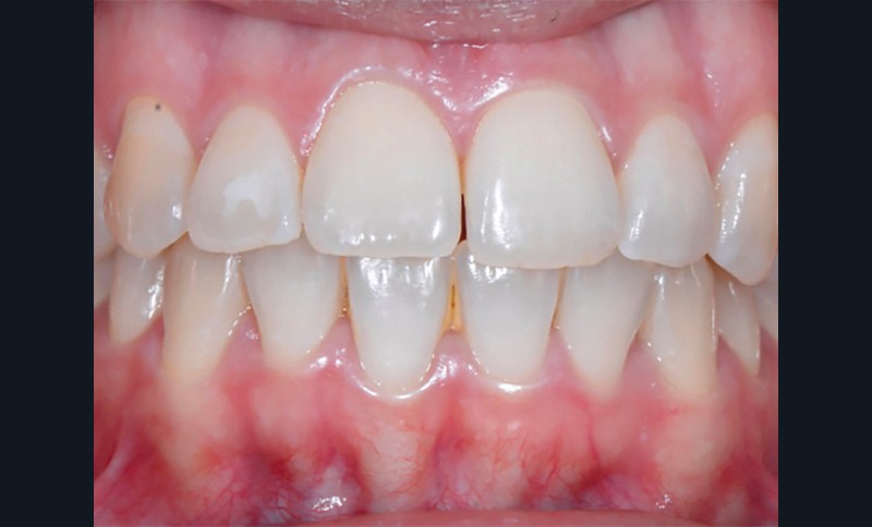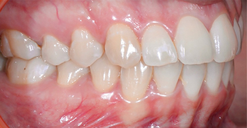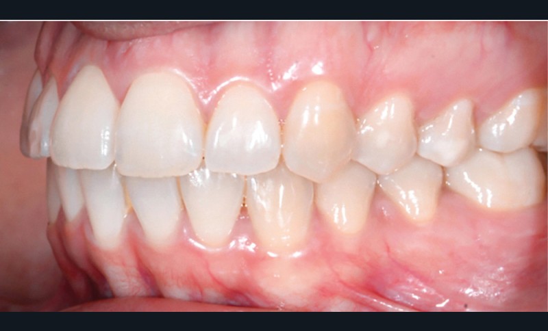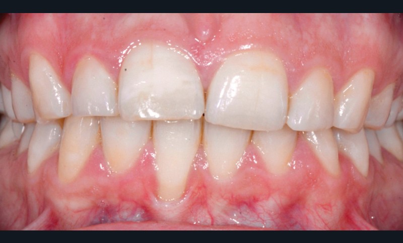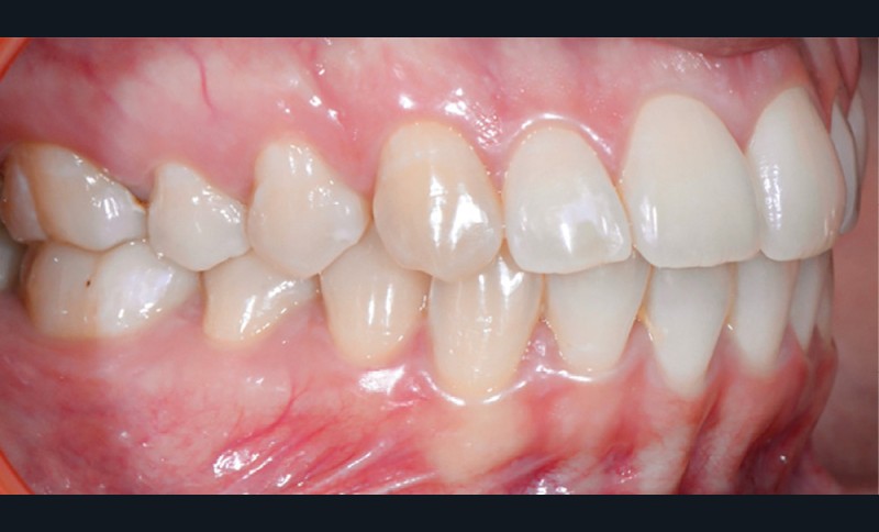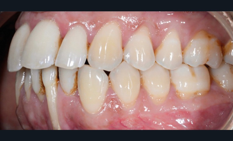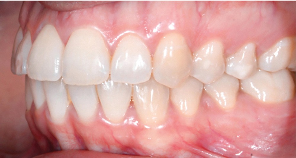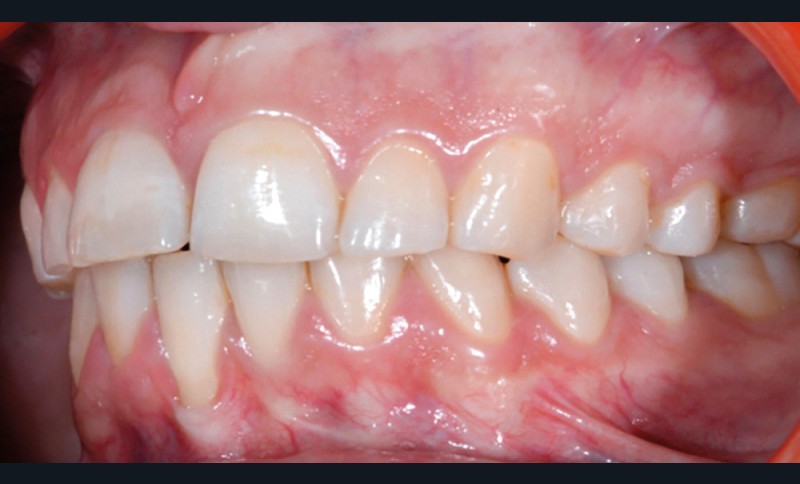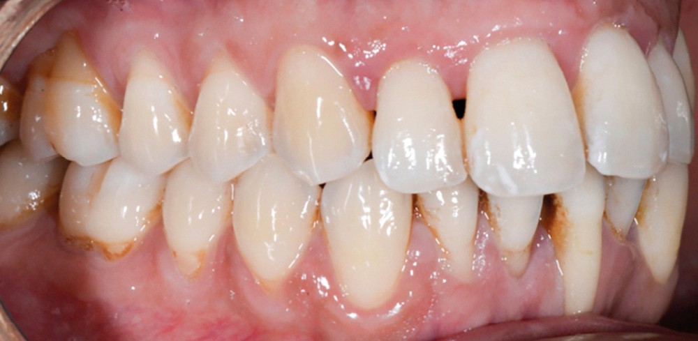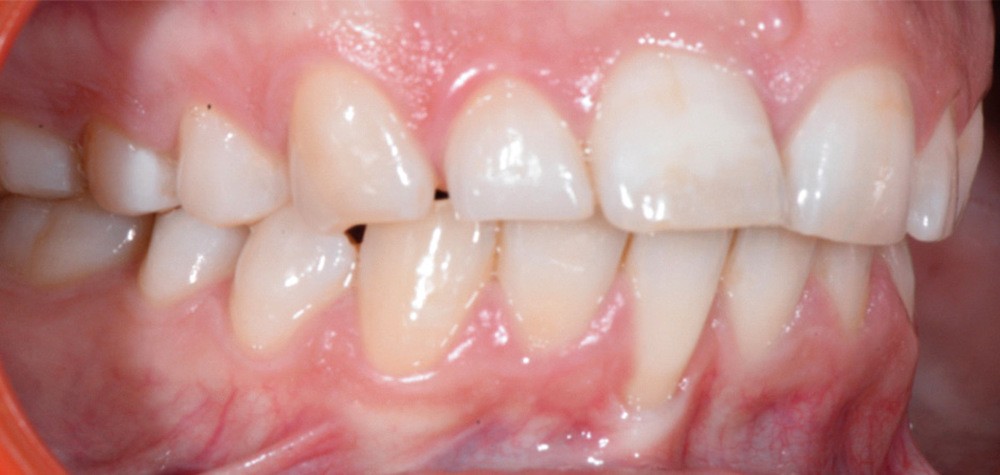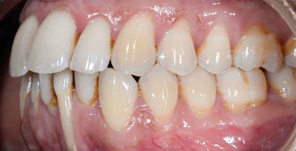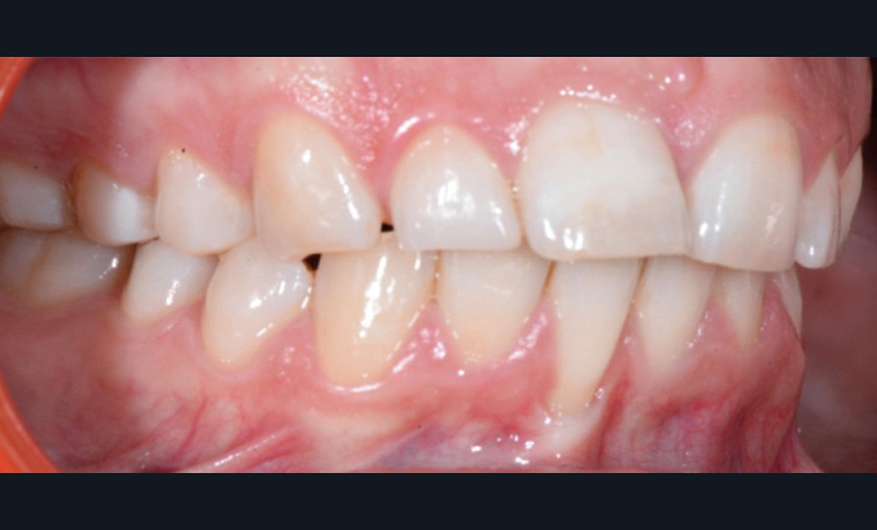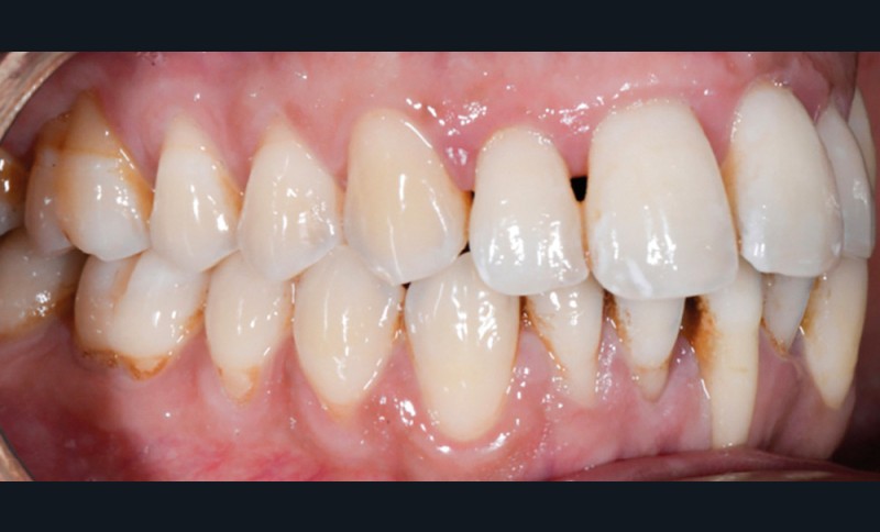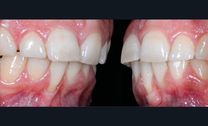 En fin de compte, il s’agit d’un syndrome du fil sur la 21 de type « X effect », un syndrome du fil sur la 41 de type « X effect » ainsi qu’un syndrome du fil sur la 33 de type « twist effect ». Pour résoudre ces problématiques, nous avons préconisé de déposer les contentions, de réaliser un traitement orthodontique maxillo-mandibulaire correctif suivi d’une chirurgie muco-gingivale.
