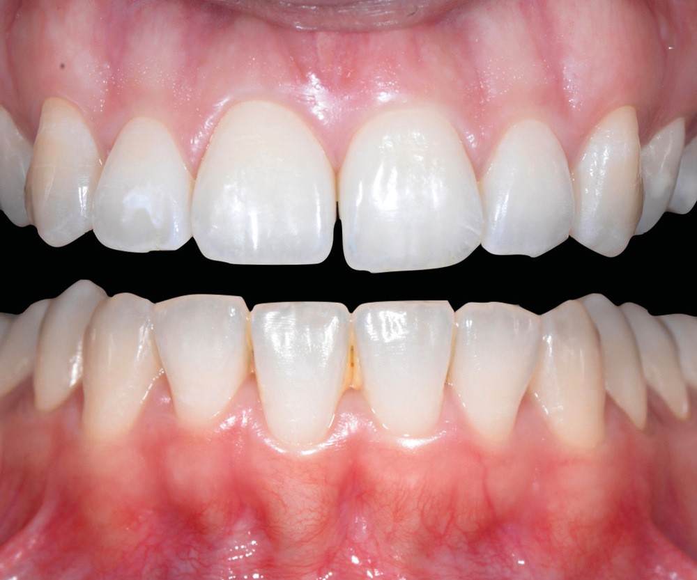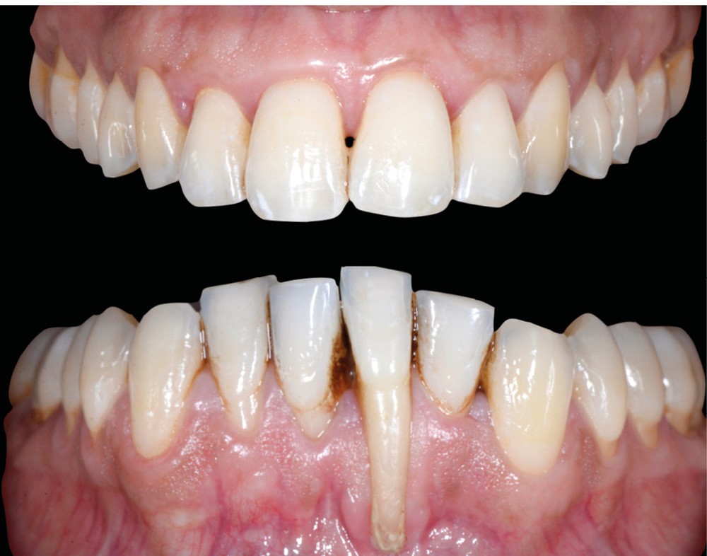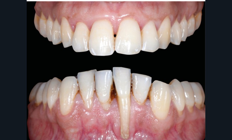 Les résultats de notre recherche bibliographique nous ont permis de proposer une définition clinique du SF. Celui-ci correspond à des déplacements dentaires, pouvant être qualifiés d’aberrants, d’inattendus, d’inexpliqués ou d’excessifs sur des dents toujours contenues par un fil de contention orthodontique intact, sans décollement ni fracture, entraînant des conséquences dentaires et parodontales, esthétiques et/ou fonctionnelles, évolutives. Toutefois, en présence de déplacements dentaires très importants, le fil de contention peut être décollé ou fracturé en fin de processus. Les mouvements dus au SF ne correspondent ni à une récidive ni à un processus physiologique : la situation des dents retrouvée dans un SF ne concorde ni à leur position avant le traitement orthodontique ni à celle du moment de la dépose l’appareillage orthodontique. Le SF peut donc être considéré comme une nouvelle malocclusion observée après la pose d’une contention, fixe collée, en postorthodontique. À partir du moment où un SF apparaît, les conséquences dentaires et parodontales, mineures au départ, s’aggravent progressivement au fil du temps (fig. 1). Or, dans le cas d’un SF débutant, il est très difficile de le repérer et/ou de le différencier à des mouvements liés à un phénomène de récidive classique. De ce fait, l’enjeu du praticien est bien de dépister le plus précocement possible un SF débutant afin de stopper le processus et de proposer une thérapeutique personnalisée en fonction de la sévérité des signes cliniques.