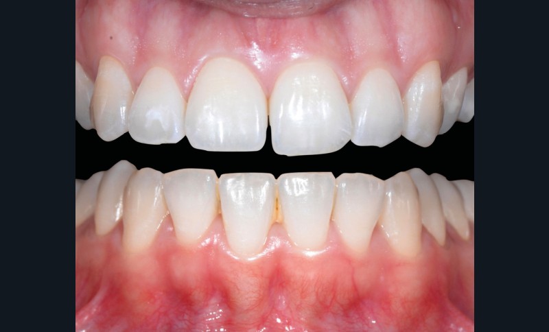Une patiente de 26 ans est référée par son dentiste généraliste pour une suspicion de syndrome du fil. Un traitement orthodontique a été réalisé 10 ans auparavant et des contentions collées ont été placées à la fin du traitement. La patiente évoque plusieurs épisodes de casse/recollage, sans détails supplémentaires. Elle présente une hygiène bucco-dentaire correcte et une classe I droite et gauche (fig. 3a). En observant la figure 3b, les 11 et 21 présentent une différence de hauteur des bords libres ainsi qu’une différence des bords gingivaux. La 41 présente une récession gingivale jusqu’à la jonction muco-gingivale (RT1 de Cairo) avec visibilité radiculaire. La 33 présente une inclinaison linguale importante, non symétrique par rapport à la dent 43. La racine de la 21 est visible par transparence à travers la gencive (fig. 3c). La figure 3d permet d’objectiver l’importance de la récession gingivale au niveau de la 41. Les vues occlusales apportent des informations complémentaires, particulièrement pertinentes (fig. 3e et f). Une contention maxillaire est présente sur les 11 et 21 uniquement et une différence de visibilité des surfaces vestibulaires (torque différentiel) sur ces mêmes dents est constatée. à la mandibule, la contention est cassée en distal de la 42 et, malgré sa présence intacte sur 33, cette dent présente une visibilité accrue de sa face vestibulaire par rapport à sa controlatérale (torque différentiel). Finalement, les dents 31 et 41 présentent également une différence de visibilité de leur face vestibulaire.