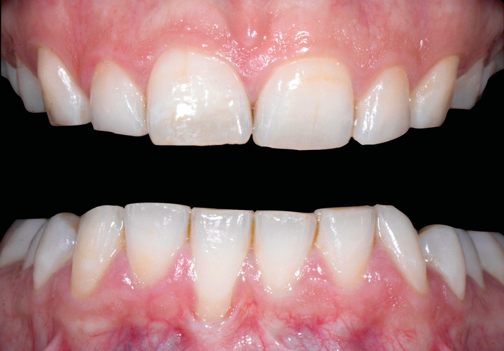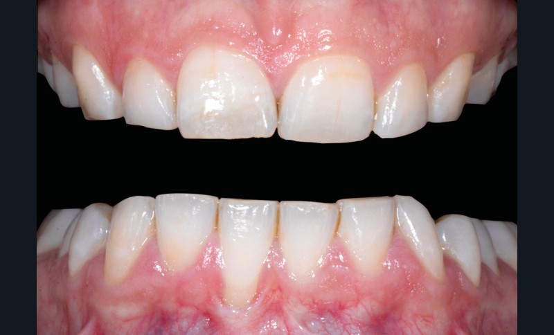 à partir de ces constatations cliniques, nous avons émis l’hypothèse d’un syndrome du fil débutant sur la 41, de type « X effect », et nous avons indiqué le remplacement de cette contention par une nouvelle 3 mois après la dépose de cette dernière – une amélioration spontanée de la situation clinique se produit généralement après la dépose de la contention – en tenant compte de toutes les précautions nécessaires à sa réalisation [21] (fil parfaitement passif, collage indirect de la contention réalisée au laboratoire de prothèse…).